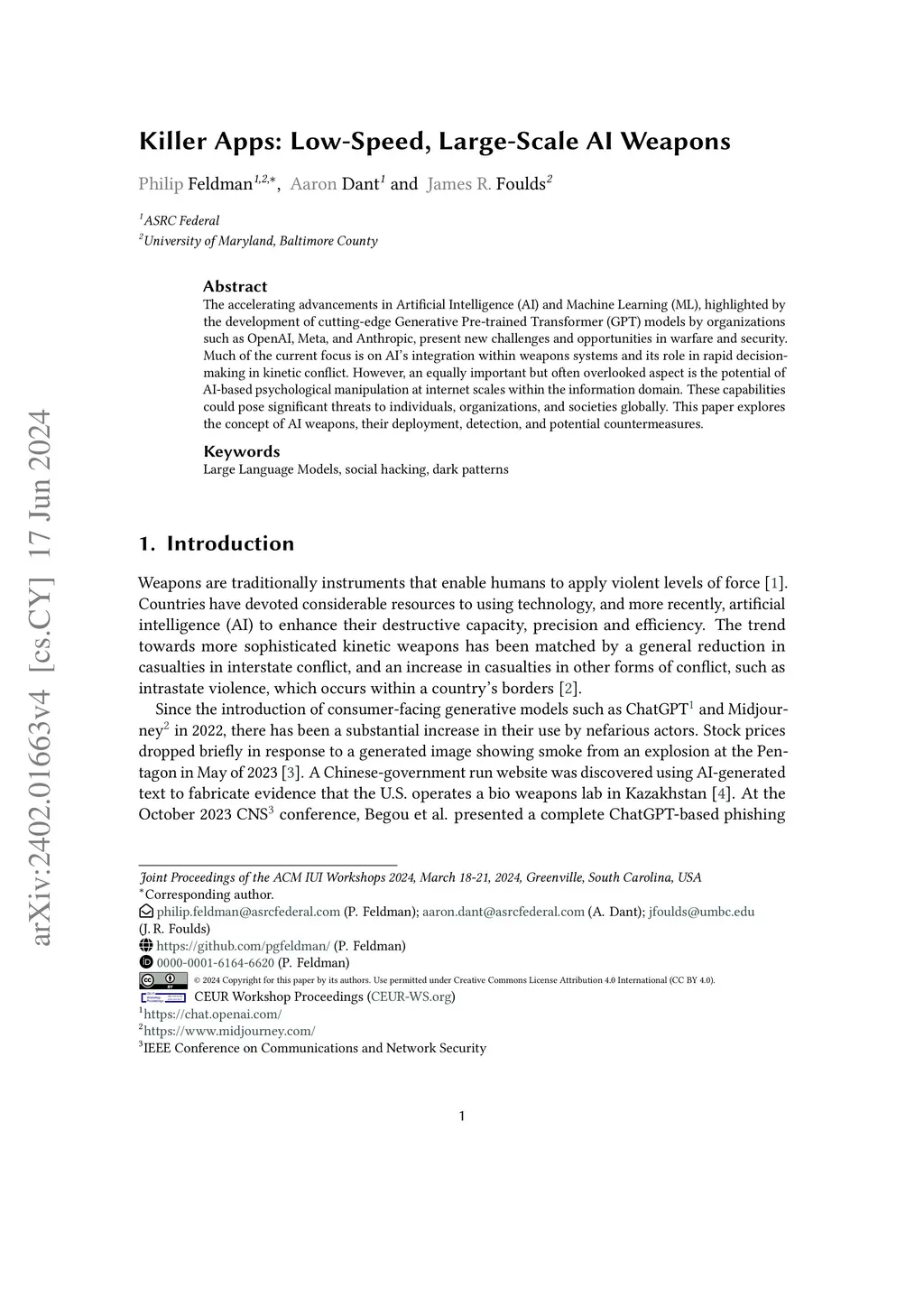 The accelerating advancements in Artificial Intelligence (AI) and Machine Learning (ML), highlighted by the development of cutting-edge Generative Pre-trained Transformer (GPT) models by organizations such as OpenAI, Meta, and Anthropic, present new challenges and opportunities in warfare and security. Much of the current focus is on AI's integration within weapons systems and its role in rapid decision-making in kinetic conflict. However, an equally important but often overlooked aspect is the potential of AI-based psychological manipulation at internet scales within the information domain. These capabilities could pose significant threats to individuals, organizations, and societies globally. This paper explores the concept of AI weapons, their deployment, detection, and potential countermeasures.