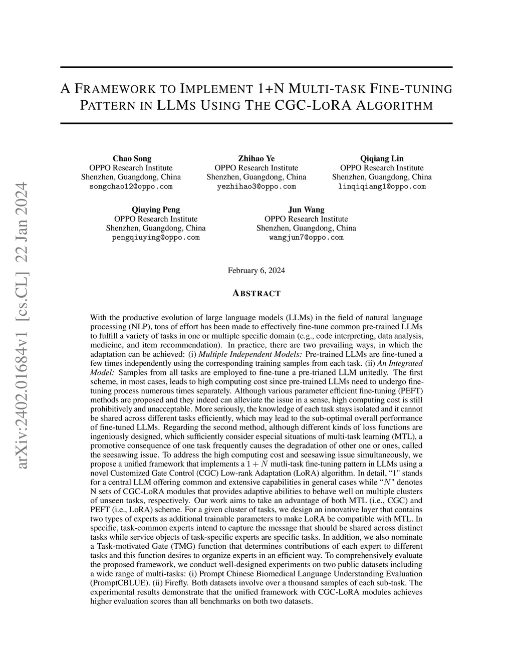 With the productive evolution of large language models (LLMs) in the field of natural language processing (NLP), tons of effort has been made to effectively fine-tune common pre-trained LLMs to fulfill a variety of tasks in one or multiple specific domain. In practice, there are two prevailing ways, in which the adaptation can be achieved: (i) Multiple Independent Models: Pre-trained LLMs are fine-tuned a few times independently using the corresponding training samples from each task. (ii) An Integrated Model: Samples from all tasks are employed to fine-tune a pre-trianed LLM unitedly. To address the high computing cost and seesawing issue simultaneously, we propose a unified framework that implements a 1 + N mutli-task fine-tuning pattern in LLMs using a novel Customized Gate Control (CGC) Low-rank Adaptation (LoRA) algorithm. Our work aims to take an advantage of both MTL (i.e., CGC) and PEFT (i.e., LoRA) scheme. For a given cluster of tasks, we design an innovative layer that contains two types of experts as additional trainable parameters to make LoRA be compatible with MTL. To comprehensively evaluate the proposed framework, we conduct well-designed experiments on two public datasets. The experimental results demonstrate that the unified framework with CGC-LoRA modules achieves higher evaluation scores than all benchmarks on both two datasets.