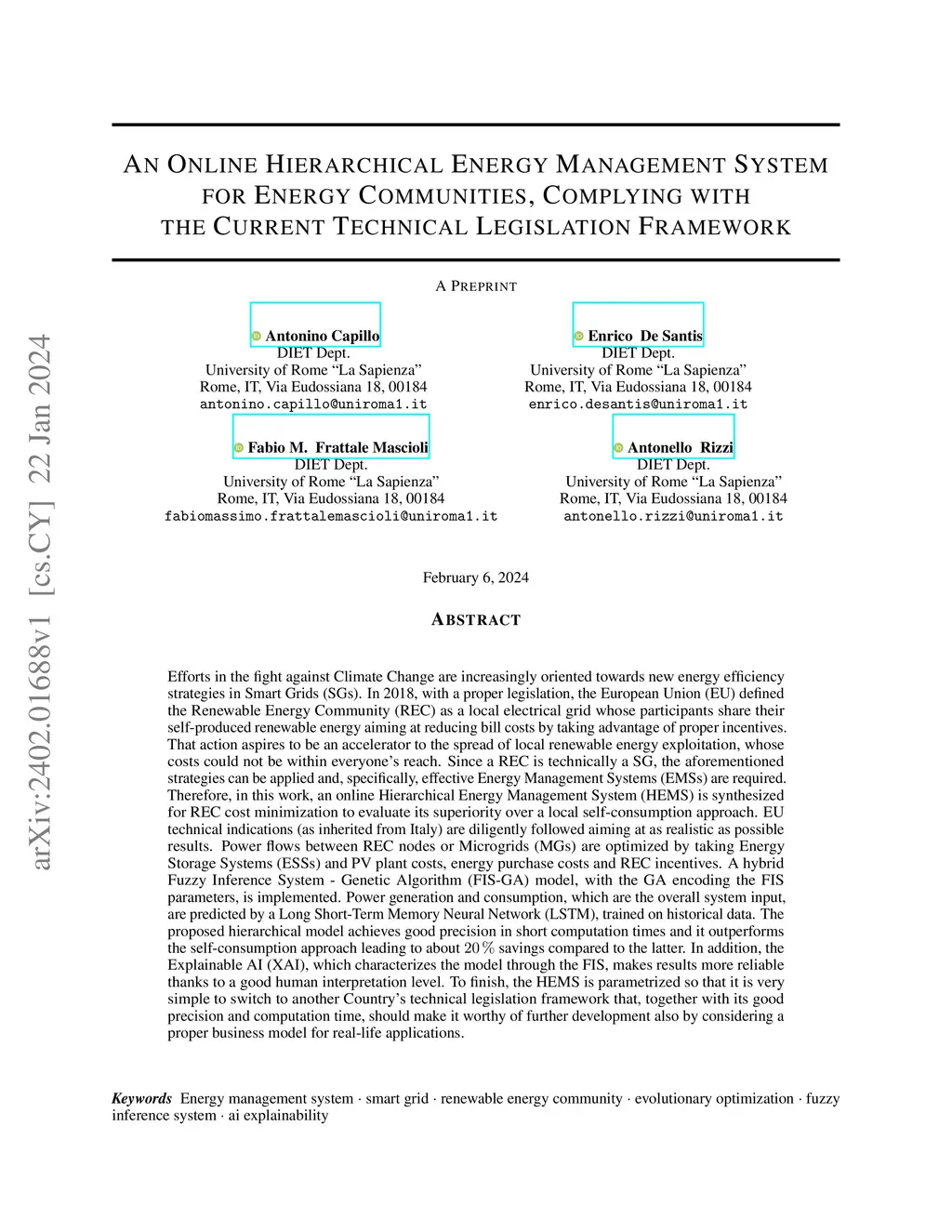 Efforts in the fight against Climate Change are increasingly oriented towards new energy efficiency strategies in Smart Grids (SGs). In 2018, with proper legislation, the European Union (EU) defined the Renewable Energy Community (REC) as a local electrical grid whose participants share their self-produced renewable energy, aiming at reducing bill costs by taking advantage of proper incentives. That action aspires to accelerate the spread of local renewable energy exploitation, whose costs could not be within everyone's reach. Since a REC is technically an SG, the strategies above can be applied, and specifically, practical Energy Management Systems (EMSs) are required. Therefore, in this work, an online Hierarchical EMS (HEMS) is synthesized for REC cost minimization to evaluate its superiority over a local self-consumption approach. EU technical indications (as inherited from Italy) are diligently followed, aiming for results that are as realistic as possible. Power flows between REC nodes, or Microgrids (MGs) are optimized by taking Energy Storage Systems (ESSs) and PV plant costs, energy purchase costs, and REC incentives. A hybrid Fuzzy Inference System - Genetic Algorithm (FIS-GA) model is implemented with the GA encoding the FIS parameters. Power generation and consumption, which are the overall system input, are predicted by a LSTM trained on historical data. The proposed hierarchical model achieves good precision in short computation times and outperforms the self-consumption approach, leading to about 20% savings compared to the latter. In addition, the Explainable AI (XAI), which characterizes the model through the FIS, makes results more reliable thanks to an excellent human interpretation level. To finish, the HEMS is parametrized so that it is straightforward to switch to another Country's technical legislation framework.