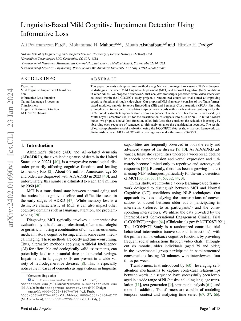 This paper presents a deep learning method using Natural Language Processing (NLP) techniques, to distinguish between Mild Cognitive Impairment (MCI) and Normal Cognitive (NC) conditions in older adults. We propose a framework that analyzes transcripts generated from video interviews collected within the I-CONECT study project, a randomized controlled trial aimed at improving cognitive functions through video chats. Our proposed NLP framework consists of two Transformer-based modules, namely Sentence Embedding (SE) and Sentence Cross Attention (SCA). First, the SE module captures contextual relationships between words within each sentence. Subsequently, the SCA module extracts temporal features from a sequence of sentences. This feature is then used by a Multi-Layer Perceptron (MLP) for the classification of subjects into MCI or NC. To build a robust model, we propose a novel loss function, called InfoLoss, that considers the reduction in entropy by observing each sequence of sentences to ultimately enhance the classification accuracy. The results of our comprehensive model evaluation using the I-CONECT dataset show that our framework can distinguish between MCI and NC with an average area under the curve of 84.75%.