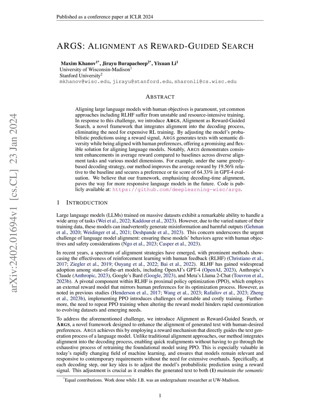 Aligning large language models with human objectives is paramount, yet common approaches including RLHF suffer from unstable and resource-intensive training. In response to this challenge, we introduce ARGS, Alignment as Reward-Guided Search, a novel framework that integrates alignment into the decoding process, eliminating the need for expensive RL training. By adjusting the model's probabilistic predictions using a reward signal, ARGS generates texts with semantic diversity while being aligned with human preferences, offering a promising and flexible solution for aligning language models. Notably, ARGS demonstrates consistent enhancements in average reward compared to baselines across diverse alignment tasks and various model dimensions. For example, under the same greedy-based decoding strategy, our method improves the average reward by 19.56% relative to the baseline and secures a preference or tie score of 64.33% in GPT-4 evaluation. We believe that our framework, emphasizing decoding-time alignment, paves the way for more responsive language models in the future. Code is publicly available at: \url{https://github.com/deeplearning-wisc/args}.