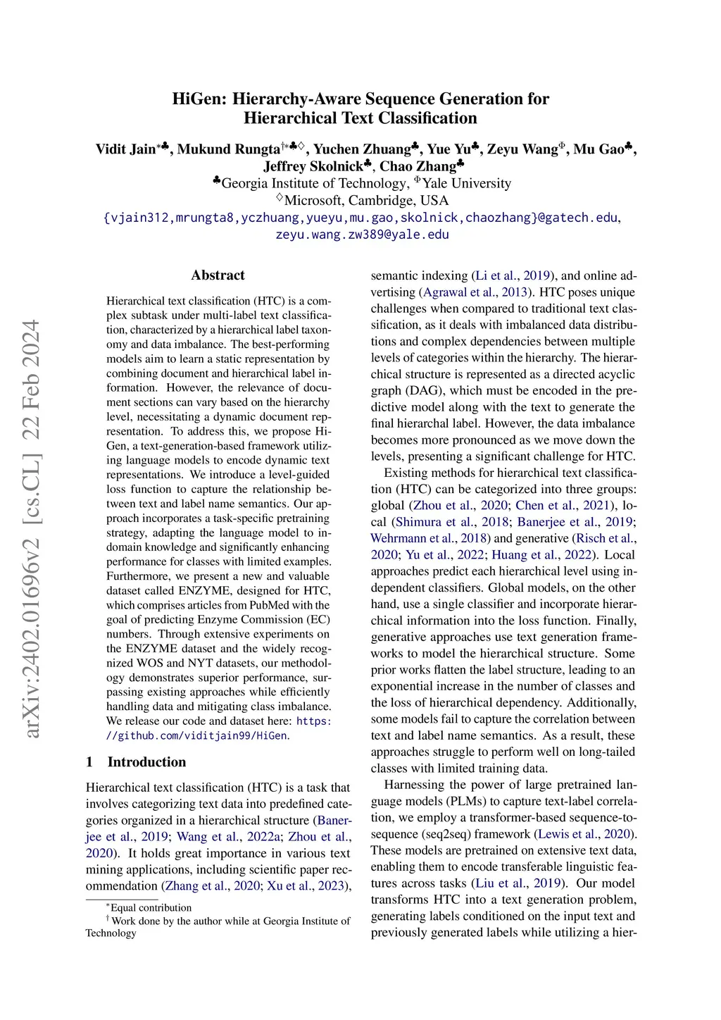 Hierarchical text classification (HTC) is a complex subtask under multi-label text classification, characterized by a hierarchical label taxonomy and data imbalance. The best-performing models aim to learn a static representation by combining document and hierarchical label information. However, the relevance of document sections can vary based on the hierarchy level, necessitating a dynamic document representation. To address this, we propose HiGen, a text-generation-based framework utilizing language models to encode dynamic text representations. We introduce a level-guided loss function to capture the relationship between text and label name semantics. Our approach incorporates a task-specific pretraining strategy, adapting the language model to in-domain knowledge and significantly enhancing performance for classes with limited examples. Furthermore, we present a new and valuable dataset called ENZYME, designed for HTC, which comprises articles from PubMed with the goal of predicting Enzyme Commission (EC) numbers. Through extensive experiments on the ENZYME dataset and the widely recognized WOS and NYT datasets, our methodology demonstrates superior performance, surpassing existing approaches while efficiently handling data and mitigating class imbalance. The data and code will be released publicly.