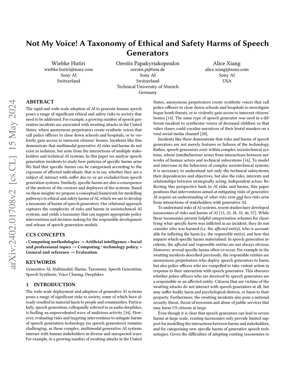 The rapid and wide-scale adoption of AI to generate human speech poses a range of significant ethical and safety risks to society that need to be addressed. For example, a growing number of speech generation incidents are associated with swatting attacks in the United States, where anonymous perpetrators create synthetic voices that call police officers to close down schools and hospitals, or to violently gain access to innocent citizens' homes. Incidents like this demonstrate that multimodal generative AI risks and harms do not exist in isolation, but arise from the interactions of multiple stakeholders and technical AI systems. In this paper we analyse speech generation incidents to study how patterns of specific harms arise. We find that specific harms can be categorised according to the exposure of affected individuals, that is to say whether they are a subject of, interact with, suffer due to, or are excluded from speech generation systems. Similarly, specific harms are also a consequence of the motives of the creators and deployers of the systems. Based on these insights we propose a conceptual framework for modelling pathways to ethical and safety harms of AI, which we use to develop a taxonomy of harms of speech generators. Our relational approach captures the complexity of risks and harms in sociotechnical AI systems, and yields a taxonomy that can support appropriate policy interventions and decision making for the responsible development and release of speech generation models.