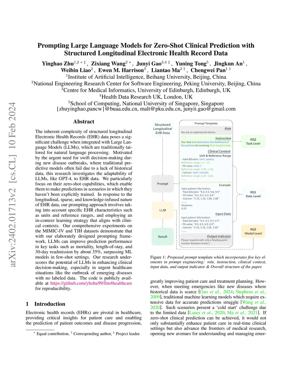 The inherent complexity of structured longitudinal Electronic Health Records (EHR) data poses a significant challenge when integrated with Large Language Models (LLMs), which are traditionally tailored for natural language processing. Motivated by the urgent need for swift decision-making during new disease outbreaks, where traditional predictive models often fail due to a lack of historical data, this research investigates the adaptability of LLMs, like GPT-4, to EHR data. We particularly focus on their zero-shot capabilities, which enable them to make predictions in scenarios in which they haven't been explicitly trained. In response to the longitudinal, sparse, and knowledge-infused nature of EHR data, our prompting approach involves taking into account specific EHR characteristics such as units and reference ranges, and employing an in-context learning strategy that aligns with clinical contexts. Our comprehensive experiments on the MIMIC-IV and TJH datasets demonstrate that with our elaborately designed prompting framework, LLMs can improve prediction performance in key tasks such as mortality, length-of-stay, and 30-day readmission by about 35\%, surpassing ML models in few-shot settings. Our research underscores the potential of LLMs in enhancing clinical decision-making, especially in urgent healthcare situations like the outbreak of emerging diseases with no labeled data. The code is publicly available at https://github.com/yhzhu99/llm4healthcare for reproducibility.