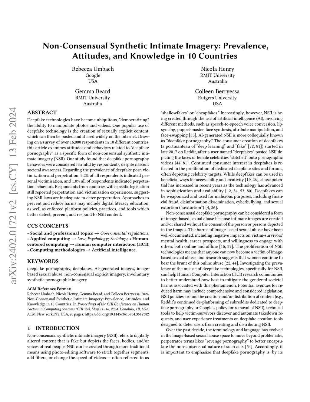 Non-Consensual Synthetic Intimate Imagery: Prevalence, Attitudes, and