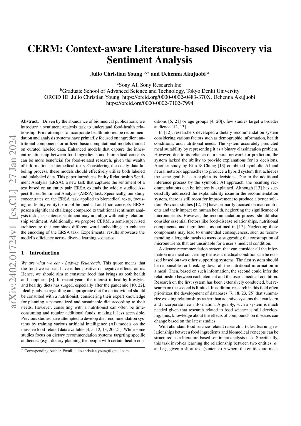 Driven by the abundance of biomedical publications, we introduce a sentiment analysis task to understand food-health relationship. Prior attempts to incorporate health into recipe recommendation and analysis systems have primarily focused on ingredient nutritional components or utilized basic computational models trained on curated labeled data. Enhanced models that capture the inherent relationship between food ingredients and biomedical concepts can be more beneficial for food-related research, given the wealth of information in biomedical texts. Considering the costly data labeling process, these models should effectively utilize both labeled and unlabeled data. This paper introduces Entity Relationship Sentiment Analysis (ERSA), a new task that captures the sentiment of a text based on an entity pair. ERSA extends the widely studied Aspect Based Sentiment Analysis (ABSA) task. Specifically, our study concentrates on the ERSA task applied to biomedical texts, focusing on (entity-entity) pairs of biomedical and food concepts. ERSA poses a significant challenge compared to traditional sentiment analysis tasks, as sentence sentiment may not align with entity relationship sentiment. Additionally, we propose CERM, a semi-supervised architecture that combines different word embeddings to enhance the encoding of the ERSA task. Experimental results showcase the model's efficiency across diverse learning scenarios.