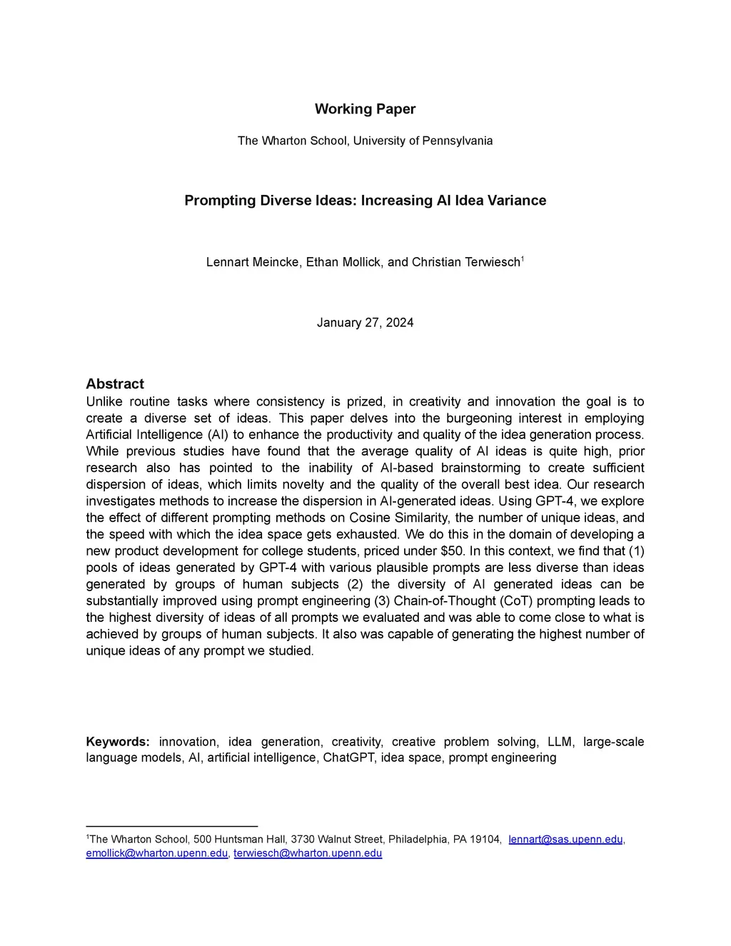 Unlike routine tasks where consistency is prized, in creativity and innovation the goal is to create a diverse set of ideas. This paper delves into the burgeoning interest in employing Artificial Intelligence (AI) to enhance the productivity and quality of the idea generation process. While previous studies have found that the average quality of AI ideas is quite high, prior research also has pointed to the inability of AI-based brainstorming to create sufficient dispersion of ideas, which limits novelty and the quality of the overall best idea. Our research investigates methods to increase the dispersion in AI-generated ideas. Using GPT-4, we explore the effect of different prompting methods on Cosine Similarity, the number of unique ideas, and the speed with which the idea space gets exhausted. We do this in the domain of developing a new product development for college students, priced under $50. In this context, we find that (1) pools of ideas generated by GPT-4 with various plausible prompts are less diverse than ideas generated by groups of human subjects (2) the diversity of AI generated ideas can be substantially improved using prompt engineering (3) Chain-of-Thought (CoT) prompting leads to the highest diversity of ideas of all prompts we evaluated and was able to come close to what is achieved by groups of human subjects. It also was capable of generating the highest number of unique ideas of any prompt we studied.