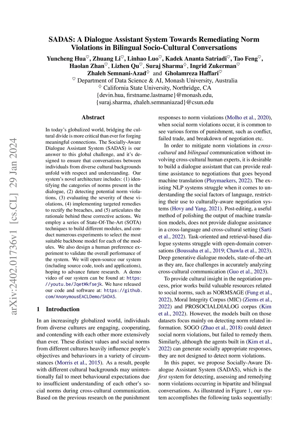In today's globalized world, bridging the cultural divide is more critical than ever for forging meaningful connections. The Socially-Aware Dialogue Assistant System (SADAS) is our answer to this global challenge, and it's designed to ensure that conversations between individuals from diverse cultural backgrounds unfold with respect and understanding. Our system's novel architecture includes: (1) identifying the categories of norms present in the dialogue, (2) detecting potential norm violations, (3) evaluating the severity of these violations, (4) implementing targeted remedies to rectify the breaches, and (5) articulates the rationale behind these corrective actions. We employ a series of State-Of-The-Art (SOTA) techniques to build different modules, and conduct numerous experiments to select the most suitable backbone model for each of the modules. We also design a human preference experiment to validate the overall performance of the system. We will open-source our system (including source code, tools and applications), hoping to advance future research. A demo video of our system can be found at:~\url{https://youtu.be/JqetWkfsejk}. We have released our code and software at:~\url{https://github.com/AnonymousEACLDemo/SADAS}.