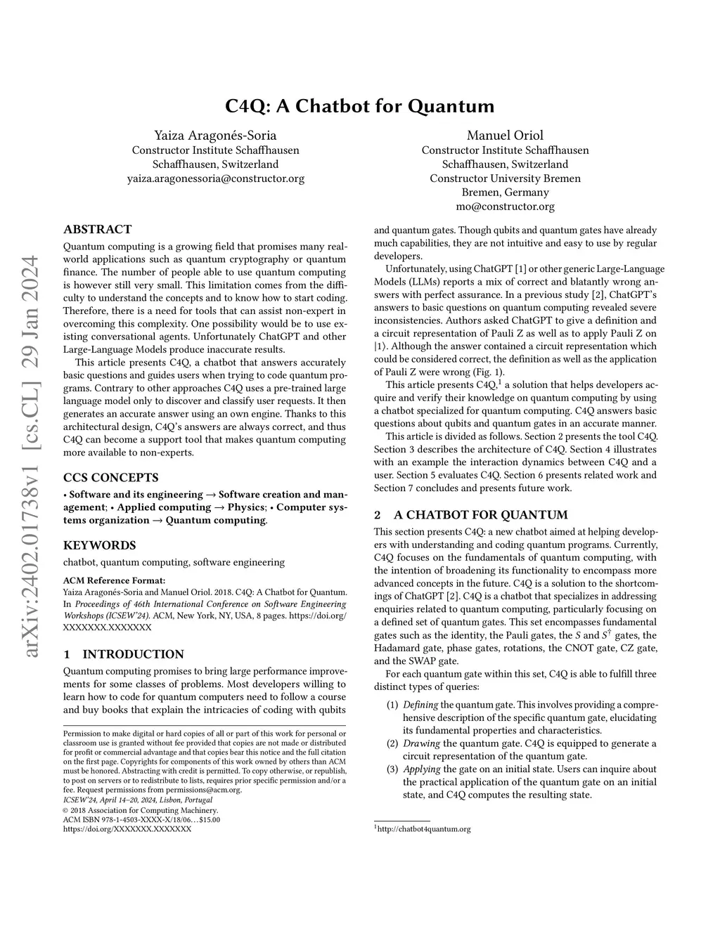 Quantum computing is a growing field that promises many real-world applications such as quantum cryptography or quantum finance. The number of people able to use quantum computing is however still very small. This limitation comes from the difficulty to understand the concepts and to know how to start coding. Therefore, there is a need for tools that can assist non-expert in overcoming this complexity. One possibility would be to use existing conversational agents. Unfortunately ChatGPT and other Large-Language Models produce inaccurate results. This article presents C4Q, a chatbot that answers accurately basic questions and guides users when trying to code quantum programs. Contrary to other approaches C4Q uses a pre-trained large language model only to discover and classify user requests. It then generates an accurate answer using an own engine. Thanks to this architectural design, C4Q's answers are always correct, and thus C4Q can become a support tool that makes quantum computing more available to non-experts.
