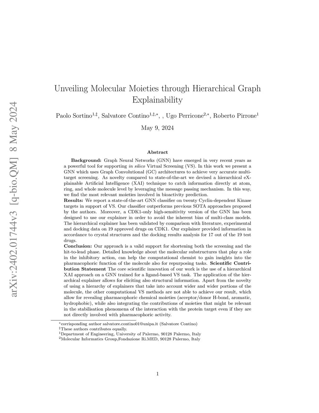 Background: Virtual Screening (VS) has become an essential tool in drug discovery, enabling the rapid and cost-effective identification of potential bioactive molecules. Among recent advancements, Graph Neural Networks (GNNs) have gained prominence for their ability to model complex molecular structures using graph-based representations. However, the integration of explainable methods to elucidate the specific contributions of molecular substructures to biological activity remains a significant challenge. This limitation hampers both the interpretability of predictive models and the rational design of novel therapeutics. Results: We trained 20 GNN models on a dataset of small molecules with the goal of predicting their activity on 20 distinct protein targets from the Kinase family. These classifiers achieved state-of-the-art performance in virtual screening tasks, demonstrating high accuracy and robustness on different targets. Building upon these models, we implemented the Hierarchical Grad-CAM graph Explainer (HGE) framework, enabling an in-depth analysis of the molecular moieties driving protein-ligand binding stabilization. HGE exploits Grad-CAM explanations at the atom, ring, and whole-molecule levels, leveraging the message-passing mechanism to highlight the most relevant chemical moieties. Validation against experimental data from the literature confirmed the ability of the explainer to recognize a molecular pattern of drugs and correctly annotate them to the known target. Conclusion: Our approach may represent a valid support to shorten both the screening and the hit discovery process. Detailed knowledge of the molecular substructures that play a role in the binding process can help the computational chemist to gain insights into the structure optimization, as well as in drug repurposing tasks.
