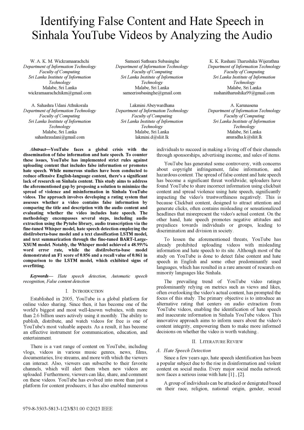 Identifying False Content and Hate Speech in Sinhala YouTube Videos by