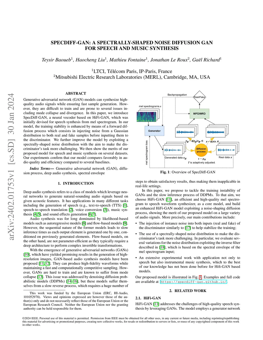 Generative adversarial network (GAN) models can synthesize highquality audio signals while ensuring fast sample generation. However, they are difficult to train and are prone to several issues including mode collapse and divergence. In this paper, we introduce SpecDiff-GAN, a neural vocoder based on HiFi-GAN, which was initially devised for speech synthesis from mel spectrogram. In our model, the training stability is enhanced by means of a forward diffusion process which consists in injecting noise from a Gaussian distribution to both real and fake samples before inputting them to the discriminator. We further improve the model by exploiting a spectrally-shaped noise distribution with the aim to make the discriminator's task more challenging. We then show the merits of our proposed model for speech and music synthesis on several datasets. Our experiments confirm that our model compares favorably in audio quality and efficiency compared to several baselines.