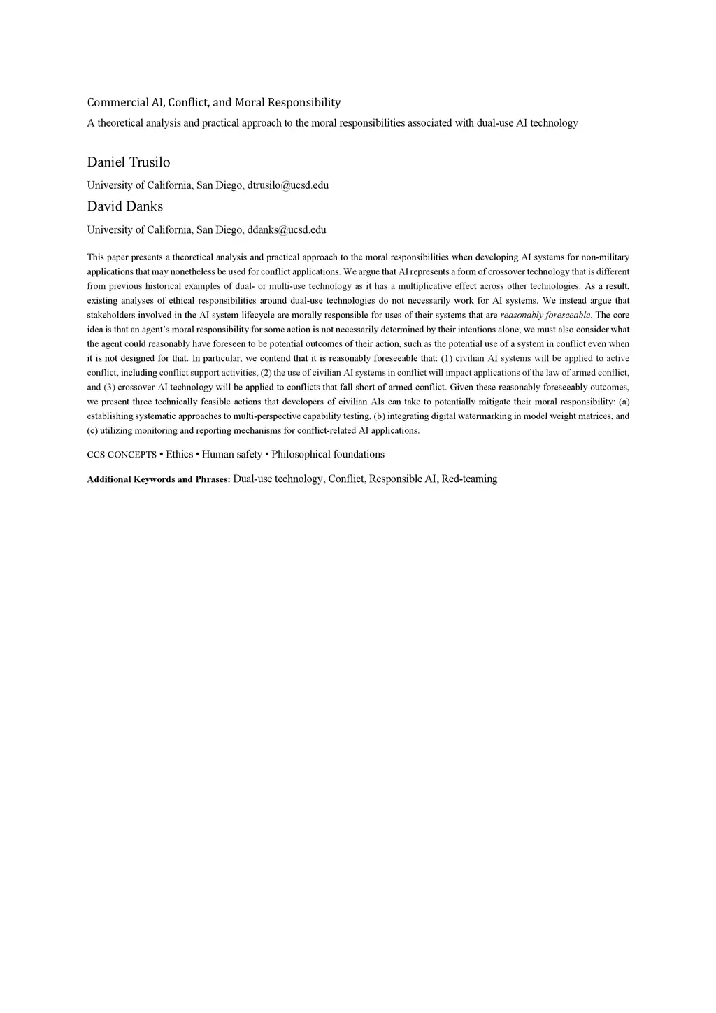 Commercial AI, Conflict, and Moral Responsibility: A theoretical