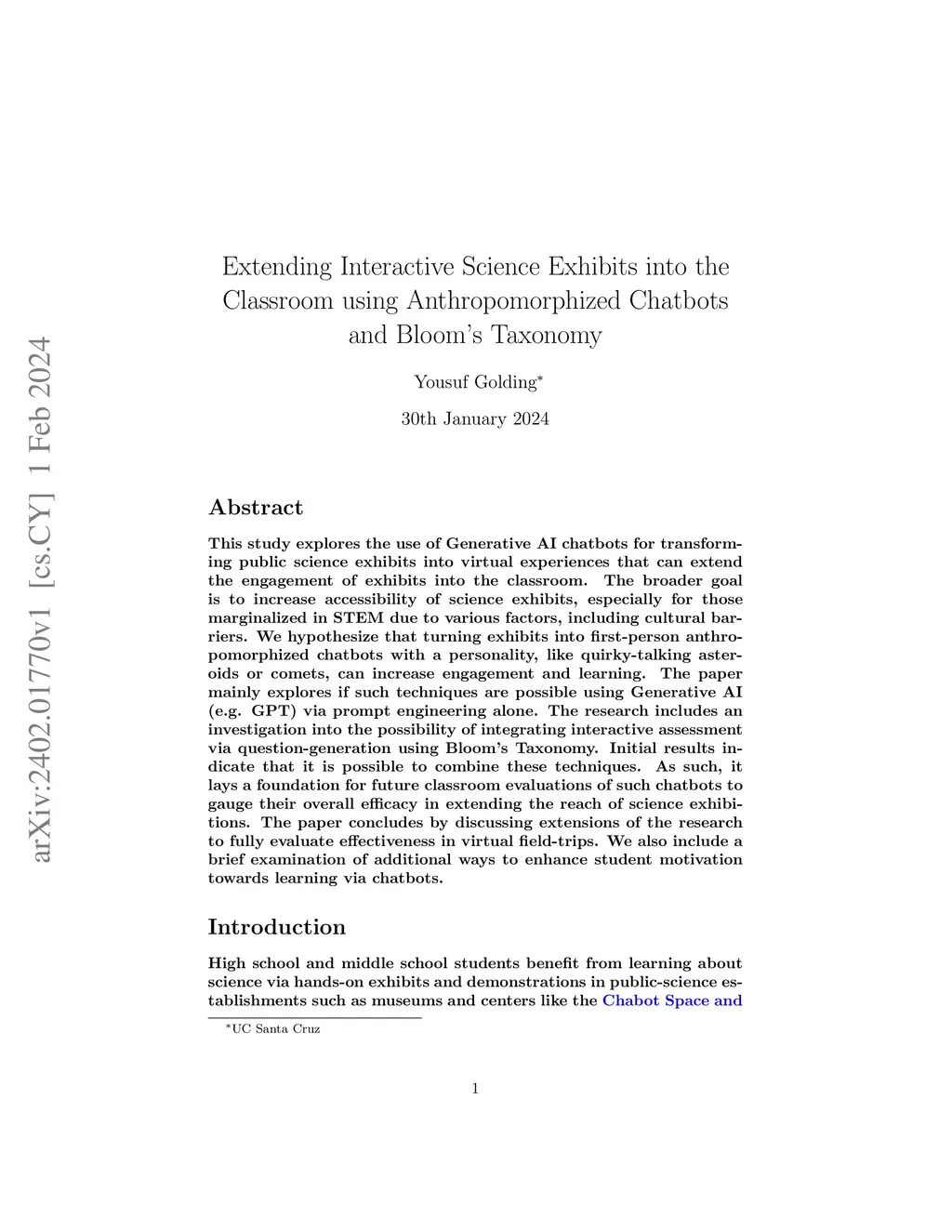 This study explores the use of Generative AI chatbots for transforming public science exhibits into virtual experiences that can extend the engagement of exhibits into the classroom. The broader goal is to increase accessibility of science exhibits, especially for those marginalized in STEM due to various factors, including cultural barriers. We hypothesize that turning exhibits into first-person anthropomorphized chatbots with a personality, like quirky-talking asteroids or comets, can increase engagement and learning. The paper mainly explores if such techniques are possible using Generative AI (e.g. GPT) via prompt engineering alone. The research includes an investigation into the possibility of integrating interactive assessment via question-generation using Bloom's Taxonomy. Initial results indicate that it is possible to combine these techniques. As such, it lays a foundation for future classroom evaluations of such chatbots to gauge their overall efficacy in extending the reach of science exhibitions. The paper concludes by discussing extensions of the research to fully evaluate effectiveness in virtual field-trips. We also include a brief examination of additional ways to enhance student motivation towards learning via chatbots.