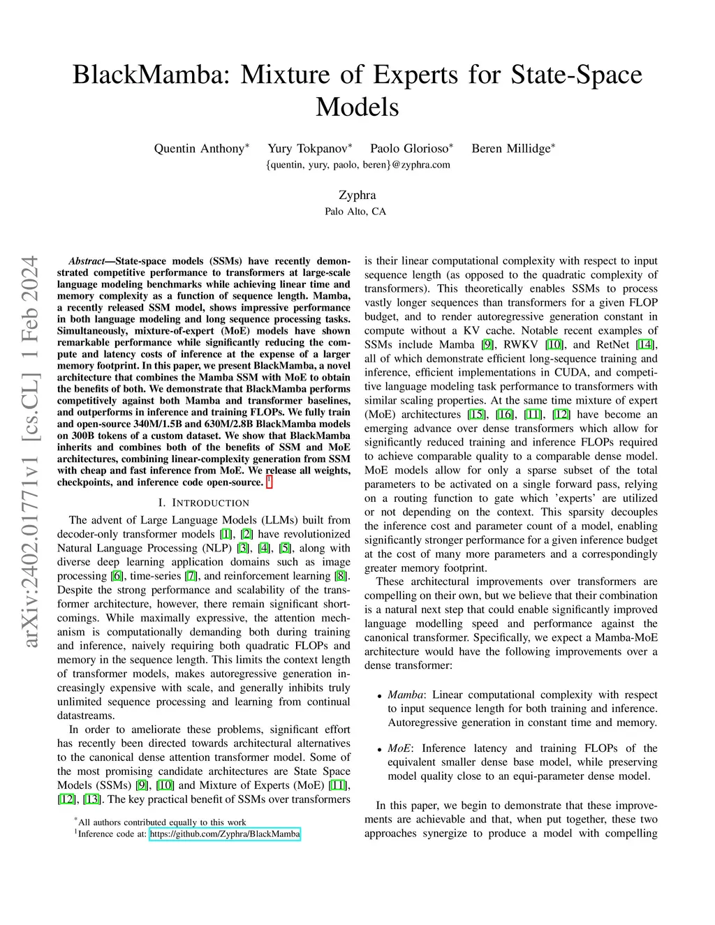 State-space models (SSMs) have recently demonstrated competitive performance to transformers at large-scale language modeling benchmarks while achieving linear time and memory complexity as a function of sequence length. Mamba, a recently released SSM model, shows impressive performance in both language modeling and long sequence processing tasks. Simultaneously, mixture-of-expert (MoE) models have shown remarkable performance while significantly reducing the compute and latency costs of inference at the expense of a larger memory footprint. In this paper, we present BlackMamba, a novel architecture that combines the Mamba SSM with MoE to obtain the benefits of both. We demonstrate that BlackMamba performs competitively against both Mamba and transformer baselines, and outperforms in inference and training FLOPs. We fully train and open-source 340M/1.5B and 630M/2.8B BlackMamba models on 300B tokens of a custom dataset. We show that BlackMamba inherits and combines both of the benefits of SSM and MoE architectures, combining linear-complexity generation from SSM with cheap and fast inference from MoE. We release all weights, checkpoints, and inference code open-source. Inference code at: https://github.com/Zyphra/BlackMamba