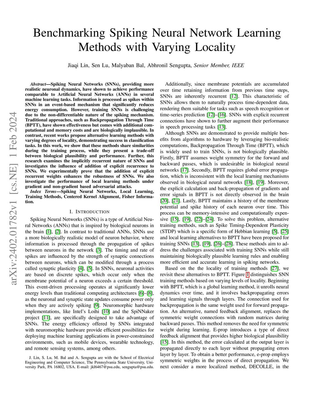 Benchmarking Spiking Neural Network Learning Methods with Varying Locality