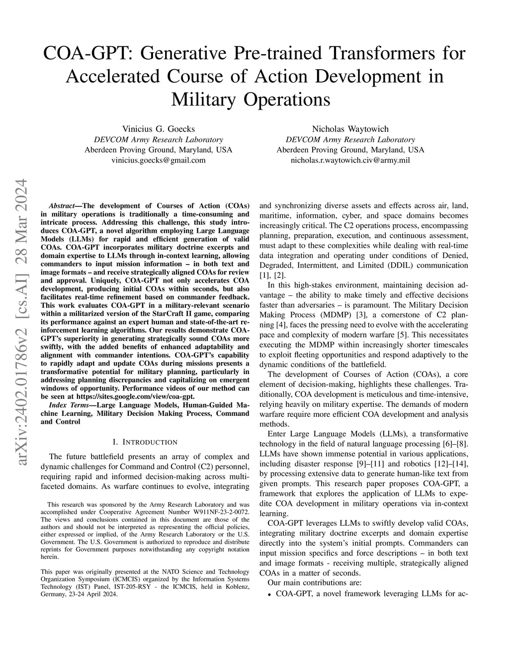 The development of Courses of Action (COAs) in military operations is traditionally a time-consuming and intricate process. Addressing this challenge, this study introduces COA-GPT, a novel algorithm employing Large Language Models (LLMs) for rapid and efficient generation of valid COAs. COA-GPT incorporates military doctrine and domain expertise to LLMs through in-context learning, allowing commanders to input mission information - in both text and image formats - and receive strategically aligned COAs for review and approval. Uniquely, COA-GPT not only accelerates COA development, producing initial COAs within seconds, but also facilitates real-time refinement based on commander feedback. This work evaluates COA-GPT in a military-relevant scenario within a militarized version of the StarCraft II game, comparing its performance against state-of-the-art reinforcement learning algorithms. Our results demonstrate COA-GPT's superiority in generating strategically sound COAs more swiftly, with added benefits of enhanced adaptability and alignment with commander intentions. COA-GPT's capability to rapidly adapt and update COAs during missions presents a transformative potential for military planning, particularly in addressing planning discrepancies and capitalizing on emergent windows of opportunities.