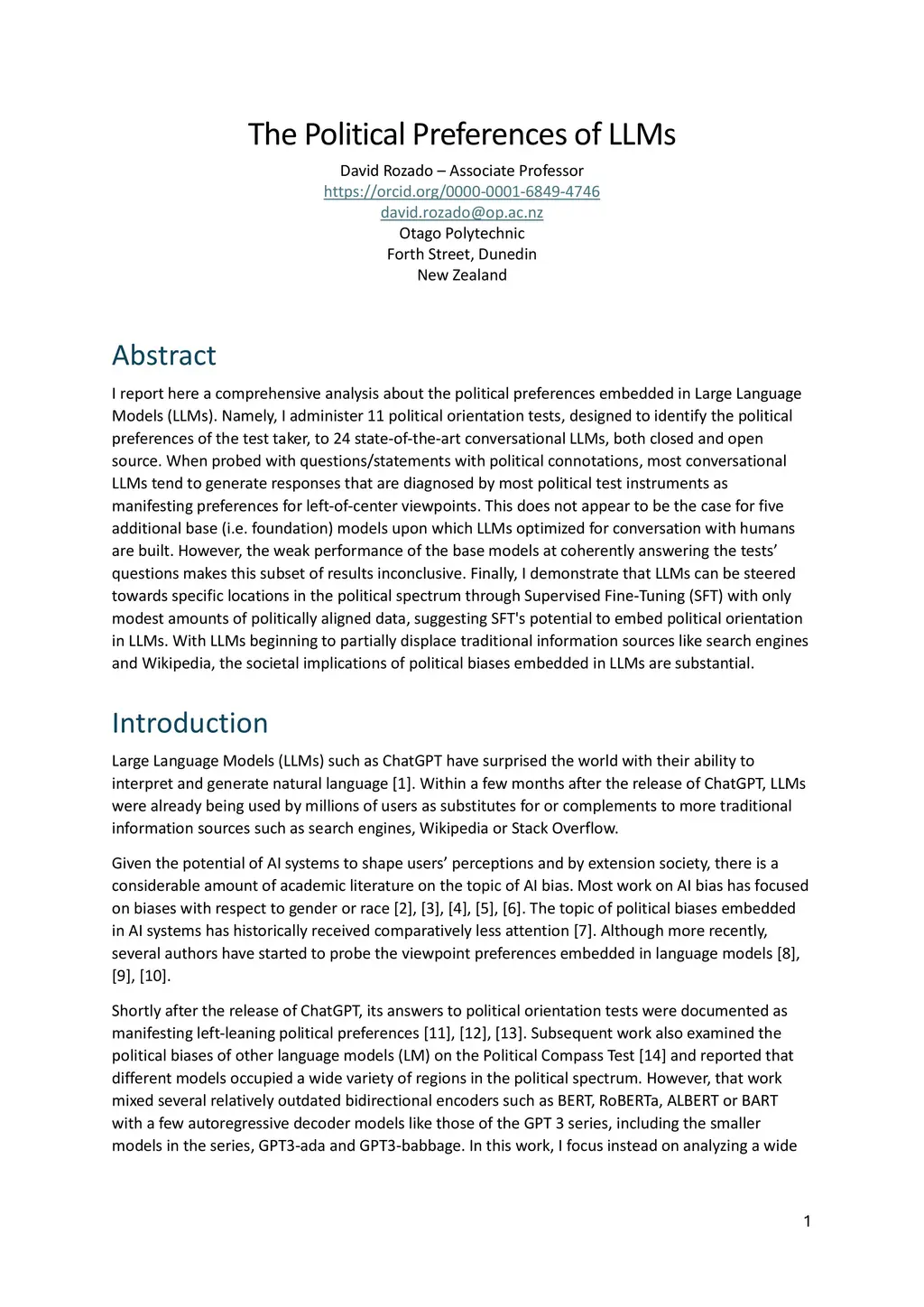 I report here a comprehensive analysis about the political preferences embedded in Large Language Models (LLMs). Namely, I administer 11 political orientation tests, designed to identify the political preferences of the test taker, to 24 state-of-the-art conversational LLMs, both closed and open source. When probed with questions/statements with political connotations, most conversational LLMs tend to generate responses that are diagnosed by most political test instruments as manifesting preferences for left-of-center viewpoints. This does not appear to be the case for five additional base (i.e. foundation) models upon which LLMs optimized for conversation with humans are built. However, the weak performance of the base models at coherently answering the tests' questions makes this subset of results inconclusive. Finally, I demonstrate that LLMs can be steered towards specific locations in the political spectrum through Supervised Fine-Tuning (SFT) with only modest amounts of politically aligned data, suggesting SFT's potential to embed political orientation in LLMs. With LLMs beginning to partially displace traditional information sources like search engines and Wikipedia, the societal implications of political biases embedded in LLMs are substantial.