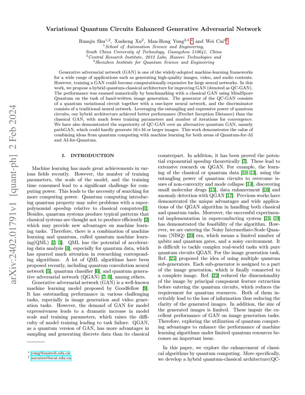 Generative adversarial network (GAN) is one of the widely-adopted machine-learning frameworks for a wide range of applications such as generating high-quality images, video, and audio contents. However, training a GAN could become computationally expensive for large neural networks. In this work, we propose a hybrid quantum-classical architecture for improving GAN (denoted as QC-GAN). The performance was examed numerically by benchmarking with a classical GAN using MindSpore Quantum on the task of hand-written image generation. The generator of the QC-GAN consists of a quantum variational circuit together with a one-layer neural network, and the discriminator consists of a traditional neural network. Leveraging the entangling and expressive power of quantum circuits, our hybrid architecture achieved better performance (Frechet Inception Distance) than the classical GAN, with much fewer training parameters and number of iterations for convergence. We have also demonstrated the superiority of QC-GAN over an alternative quantum GAN, namely pathGAN, which could hardly generate 1616 or larger images. This work demonstrates the value of combining ideas from quantum computing with machine learning for both areas of Quantum-for-AI and AI-for-Quantum.