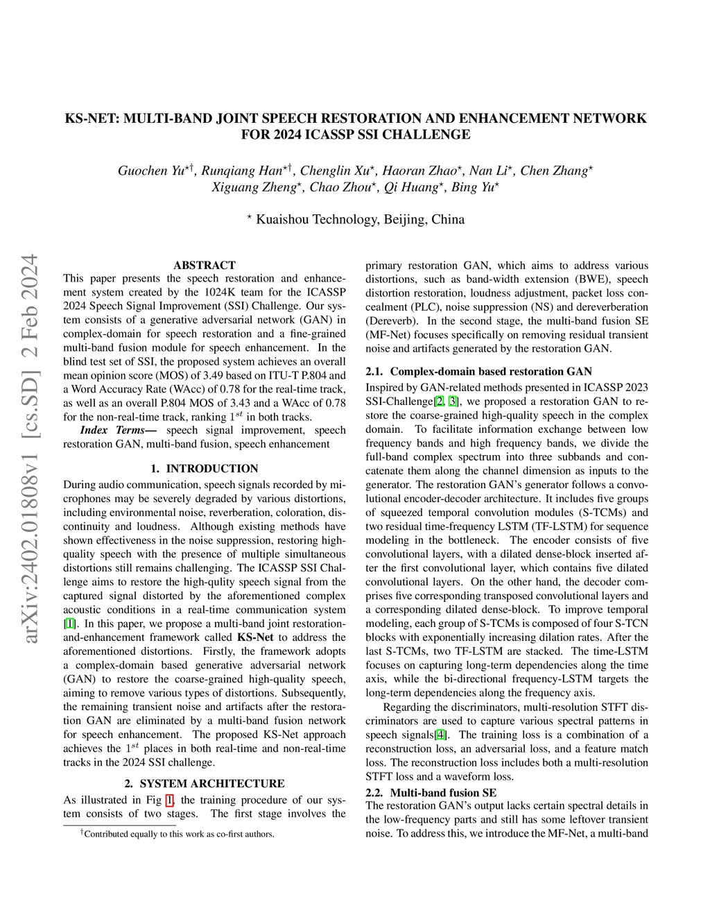 This paper presents the speech restoration and enhancement system created by the 1024K team for the ICASSP 2024 Speech Signal Improvement (SSI) Challenge. Our system consists of a generative adversarial network (GAN) in complex-domain for speech restoration and a fine-grained multi-band fusion module for speech enhancement. In the blind test set of SSI, the proposed system achieves an overall mean opinion score (MOS) of 3.49 based on ITU-T P.804 and a Word Accuracy Rate (WAcc) of 0.78 for the real-time track, as well as an overall P.804 MOS of 3.43 and a WAcc of 0.78 for the non-real-time track, ranking 1st in both tracks.