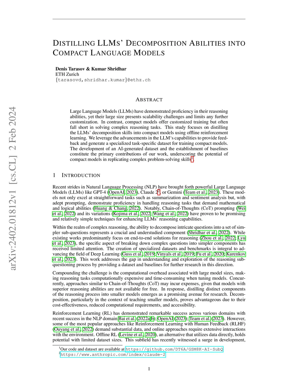 Large Language Models (LLMs) have demonstrated proficiency in their reasoning abilities, yet their large size presents scalability challenges and limits any further customization. In contrast, compact models offer customized training but often fall short in solving complex reasoning tasks. This study focuses on distilling the LLMs' decomposition skills into compact models using offline reinforcement learning. We leverage the advancements in the LLM`s capabilities to provide feedback and generate a specialized task-specific dataset for training compact models. The development of an AI-generated dataset and the establishment of baselines constitute the primary contributions of our work, underscoring the potential of compact models in replicating complex problem-solving skills.