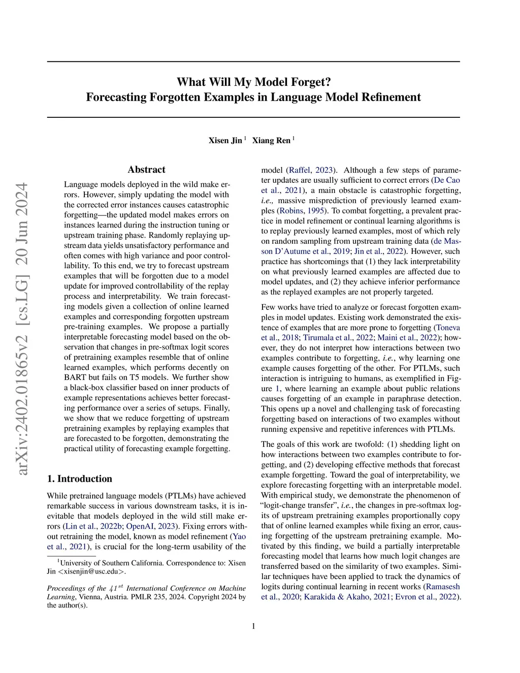Language models deployed in the wild make errors. However, simply updating the model with the corrected error instances causes catastrophic forgetting -- the updated model makes errors on instances learned during the instruction tuning or upstream training phase. Randomly replaying upstream data yields unsatisfactory performance and often comes with high variance and poor controllability. To this end, we try to forecast upstream examples that will be forgotten due to a model update for improved controllability of the replay process and interpretability. We train forecasting models given a collection of online learned examples and corresponding forgotten upstream pre-training examples. We propose a partially interpretable forecasting model based on the observation that changes in pre-softmax logit scores of pretraining examples resemble that of online learned examples, which performs decently on BART but fails on T5 models. We further show a black-box classifier based on inner products of example representations achieves better forecasting performance over a series of setups. Finally, we show that we reduce forgetting of upstream pretraining examples by replaying examples that are forecasted to be forgotten, demonstrating the practical utility of forecasting example forgetting.