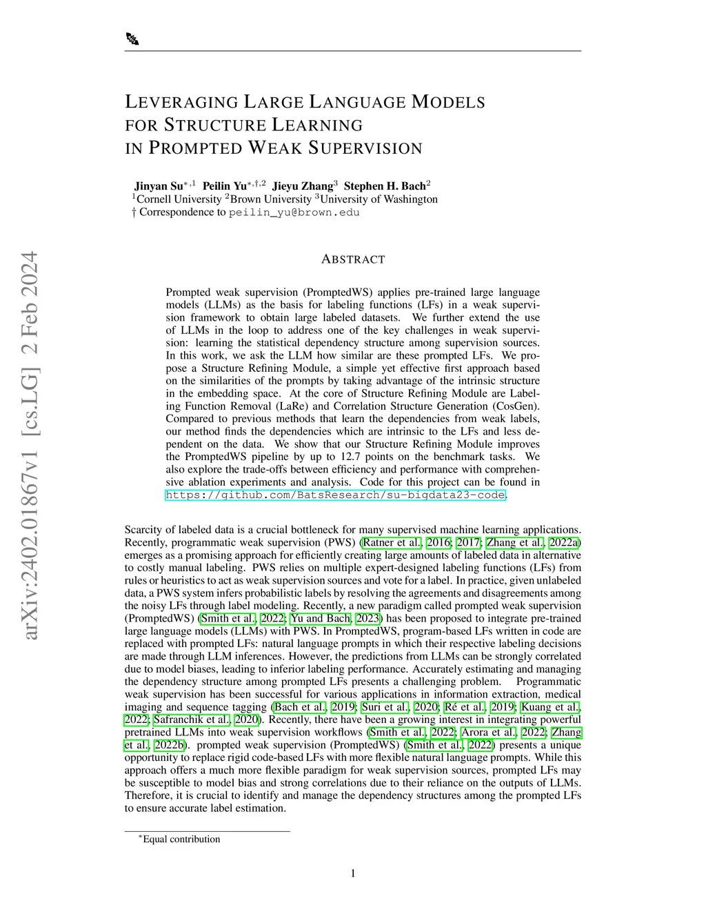 Prompted weak supervision (PromptedWS) applies pre-trained large language models (LLMs) as the basis for labeling functions (LFs) in a weak supervision framework to obtain large labeled datasets. We further extend the use of LLMs in the loop to address one of the key challenges in weak supervision: learning the statistical dependency structure among supervision sources. In this work, we ask the LLM how similar are these prompted LFs. We propose a Structure Refining Module, a simple yet effective first approach based on the similarities of the prompts by taking advantage of the intrinsic structure in the embedding space. At the core of Structure Refining Module are Labeling Function Removal (LaRe) and Correlation Structure Generation (CosGen). Compared to previous methods that learn the dependencies from weak labels, our method finds the dependencies which are intrinsic to the LFs and less dependent on the data. We show that our Structure Refining Module improves the PromptedWS pipeline by up to 12.7 points on the benchmark tasks. We also explore the trade-offs between efficiency and performance with comprehensive ablation experiments and analysis. Code for this project can be found in https://github.com/BatsResearch/su-bigdata23-code.
