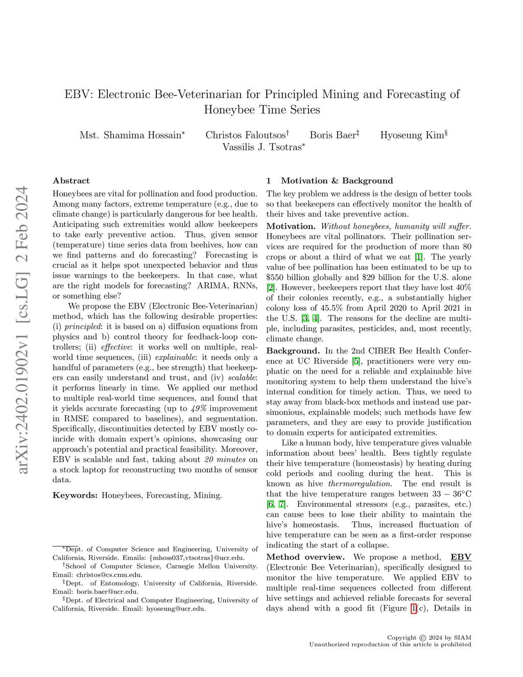 Honeybees are vital for pollination and food production. Among many factors, extreme temperature (e.g., due to climate change) is particularly dangerous for bee health. Anticipating such extremities would allow beekeepers to take early preventive action. Thus, given sensor (temperature) time series data from beehives, how can we find patterns and do forecasting? Forecasting is crucial as it helps spot unexpected behavior and thus issue warnings to the beekeepers. In that case, what are the right models for forecasting? ARIMA, RNNs, or something else? We propose the EBV (Electronic Bee-Veterinarian) method, which has the following desirable properties: (i) principled: it is based on a) diffusion equations from physics and b) control theory for feedback-loop controllers; (ii) effective: it works well on multiple, real-world time sequences, (iii) explainable: it needs only a handful of parameters (e.g., bee strength) that beekeepers can easily understand and trust, and (iv) scalable: it performs linearly in time. We applied our method to multiple real-world time sequences, and found that it yields accurate forecasting (up to 49% improvement in RMSE compared to baselines), and segmentation. Specifically, discontinuities detected by EBV mostly coincide with domain expert's opinions, showcasing our approach's potential and practical feasibility. Moreover, EBV is scalable and fast, taking about 20 minutes on a stock laptop for reconstructing two months of sensor data.