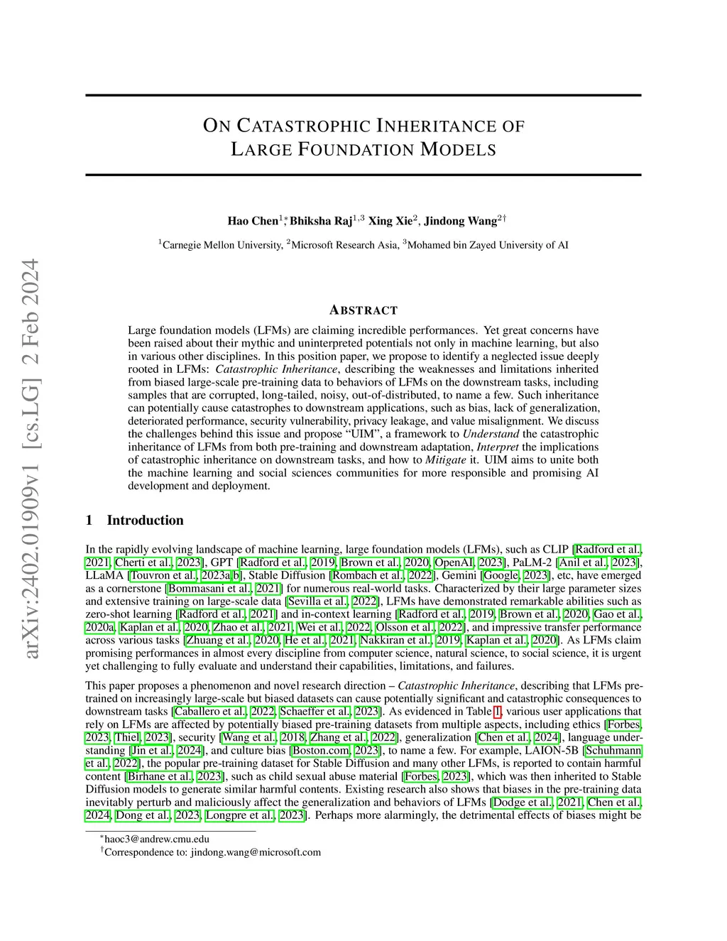 Large foundation models (LFMs) are claiming incredible performances. Yet great concerns have been raised about their mythic and uninterpreted potentials not only in machine learning, but also in various other disciplines. In this position paper, we propose to identify a neglected issue deeply rooted in LFMs: Catastrophic Inheritance, describing the weaknesses and limitations inherited from biased large-scale pre-training data to behaviors of LFMs on the downstream tasks, including samples that are corrupted, long-tailed, noisy, out-of-distributed, to name a few. Such inheritance can potentially cause catastrophes to downstream applications, such as bias, lack of generalization, deteriorated performance, security vulnerability, privacy leakage, and value misalignment. We discuss the challenges behind this issue and propose UIM, a framework to Understand the catastrophic inheritance of LFMs from both pre-training and downstream adaptation, Interpret the implications of catastrophic inheritance on downstream tasks, and how to Mitigate it. UIM aims to unite both the machine learning and social sciences communities for more responsible and promising AI development and deployment.