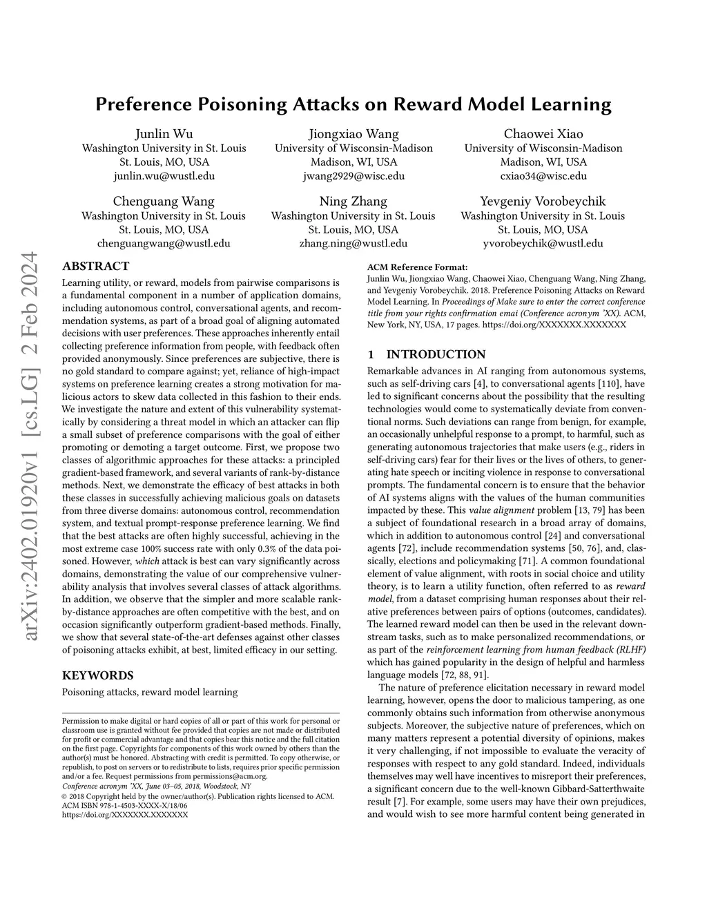 Preference Poisoning Attacks on Reward Model Learning