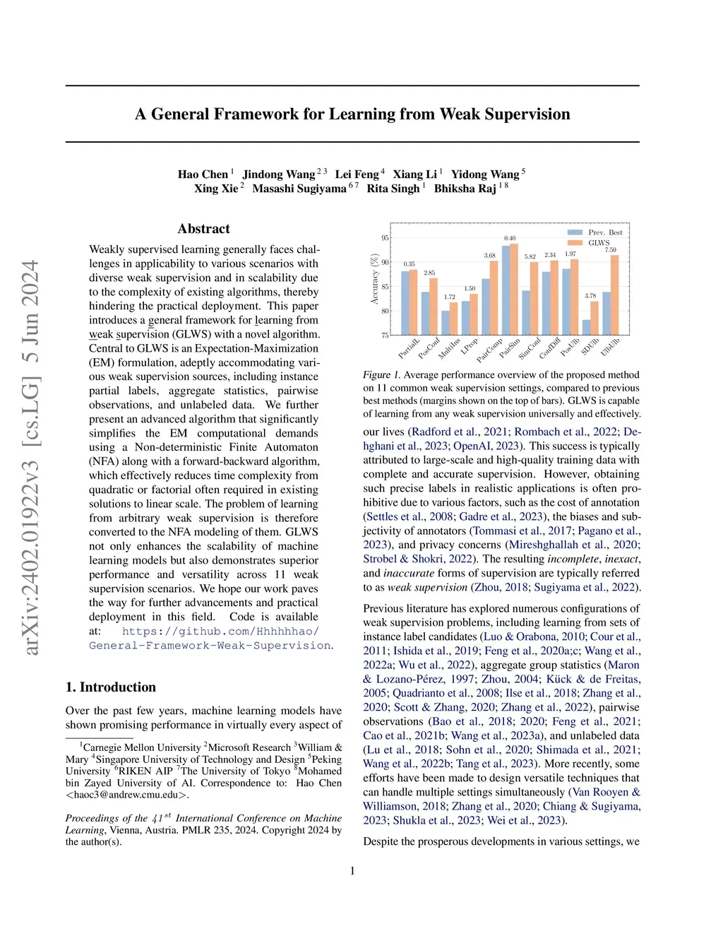 Weakly supervised learning generally faces challenges in applicability to various scenarios with diverse weak supervision and in scalability due to the complexity of existing algorithms, thereby hindering the practical deployment. This paper introduces a general framework for learning from weak supervision (GLWS) with a novel algorithm. Central to GLWS is an Expectation-Maximization (EM) formulation, adeptly accommodating various weak supervision sources, including instance partial labels, aggregate statistics, pairwise observations, and unlabeled data. We further present an advanced algorithm that significantly simplifies the EM computational demands using a Non-deterministic Finite Automaton (NFA) along with a forward-backward algorithm, which effectively reduces time complexity from quadratic or factorial often required in existing solutions to linear scale. The problem of learning from arbitrary weak supervision is therefore converted to the NFA modeling of them. GLWS not only enhances the scalability of machine learning models but also demonstrates superior performance and versatility across 11 weak supervision scenarios. We hope our work paves the way for further advancements and practical deployment in this field.
