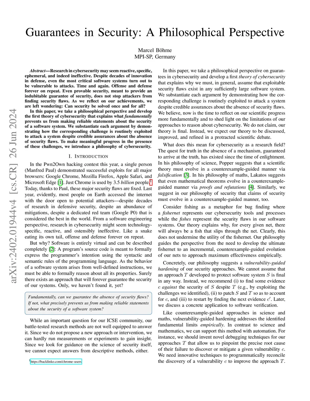 Research in cybersecurity may seem reactive, specific, ephemeral, and indeed ineffective. Despite decades of innovation in defense, even the most critical software systems turn out to be vulnerable to attacks. Time and again. Offense and defense forever on repeat. Even provable security, meant to provide an indubitable guarantee of security, does not stop attackers from finding security flaws. As we reflect on our achievements, we are left wondering: Can security be solved once and for all? In this paper, we take a philosophical perspective and develop the first theory of cybersecurity that explains what *fundamentally* prevents us from making reliable statements about the security of a software system. We substantiate each argument by demonstrating how the corresponding challenge is routinely exploited to attack a system despite credible assurances about the absence of security flaws. To make meaningful progress in the presence of these challenges, we introduce a philosophy of cybersecurity.