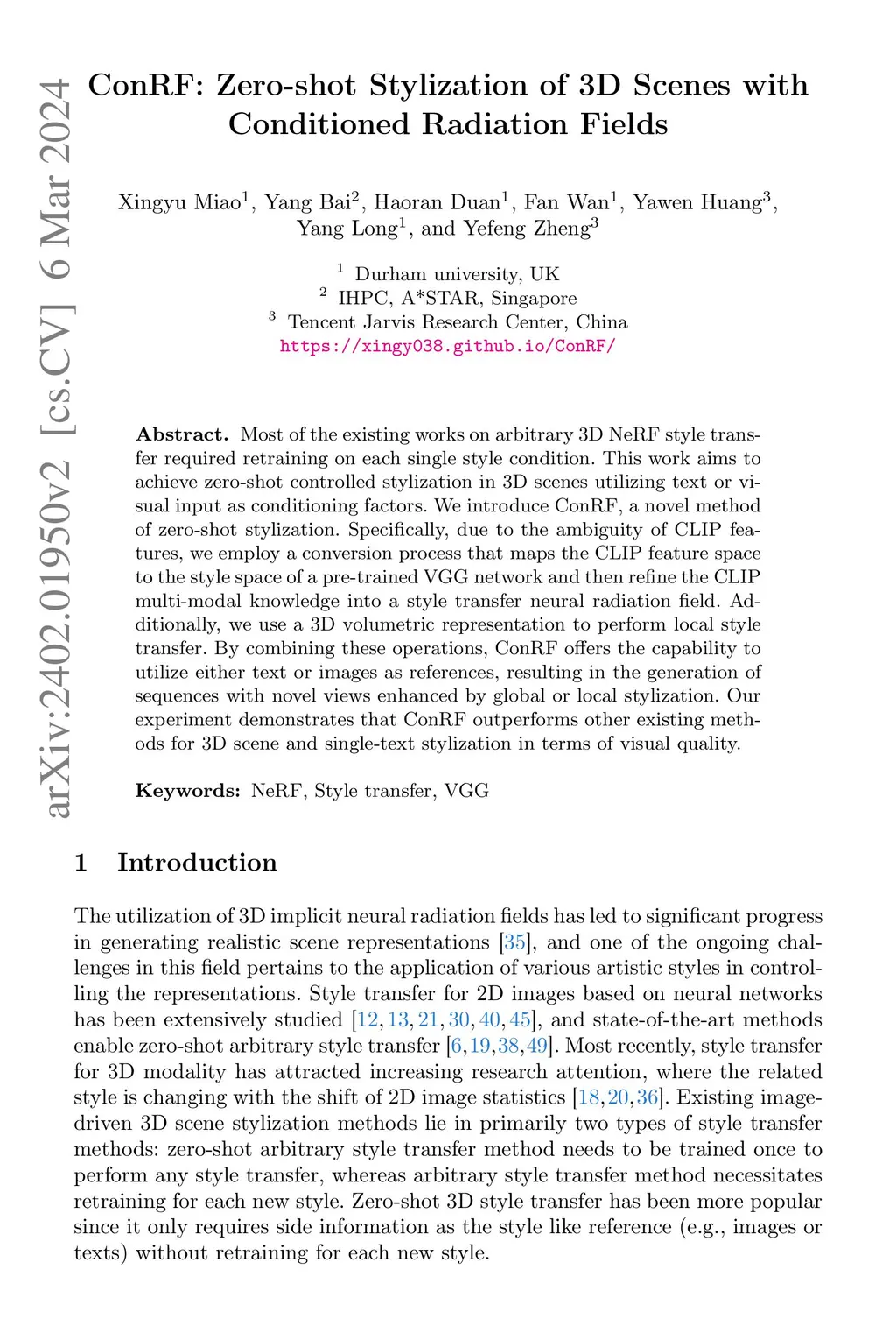 Most of the existing works on arbitrary 3D NeRF style transfer required retraining on each single style condition. This work aims to achieve zero-shot controlled stylization in 3D scenes utilizing text or visual input as conditioning factors. We introduce ConRF, a novel method of zero-shot stylization. Specifically, due to the ambiguity of CLIP features, we employ a conversion process that maps the CLIP feature space to the style space of a pre-trained VGG network and then refine the CLIP multi-modal knowledge into a style transfer neural radiation field. Additionally, we use a 3D volumetric representation to perform local style transfer. By combining these operations, ConRF offers the capability to utilize either text or images as references, resulting in the generation of sequences with novel views enhanced by global or local stylization. Our experiment demonstrates that ConRF outperforms other existing methods for 3D scene and single-text stylization in terms of visual quality.