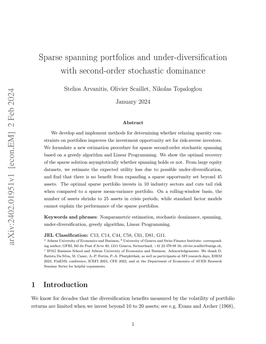 We develop and implement methods for determining whether relaxing sparsity constraints on portfolios improves the investment opportunity set for risk-averse investors. We formulate a new estimation procedure for sparse second-order stochastic spanning based on a greedy algorithm and Linear Programming. We show the optimal recovery of the sparse solution asymptotically whether spanning holds or not. From large equity datasets, we estimate the expected utility loss due to possible under-diversification, and find that there is no benefit from expanding a sparse opportunity set beyond 45 assets. The optimal sparse portfolio invests in 10 industry sectors and cuts tail risk when compared to a sparse mean-variance portfolio. On a rolling-window basis, the number of assets shrinks to 25 assets in crisis periods, while standard factor models cannot explain the performance of the sparse portfolios.