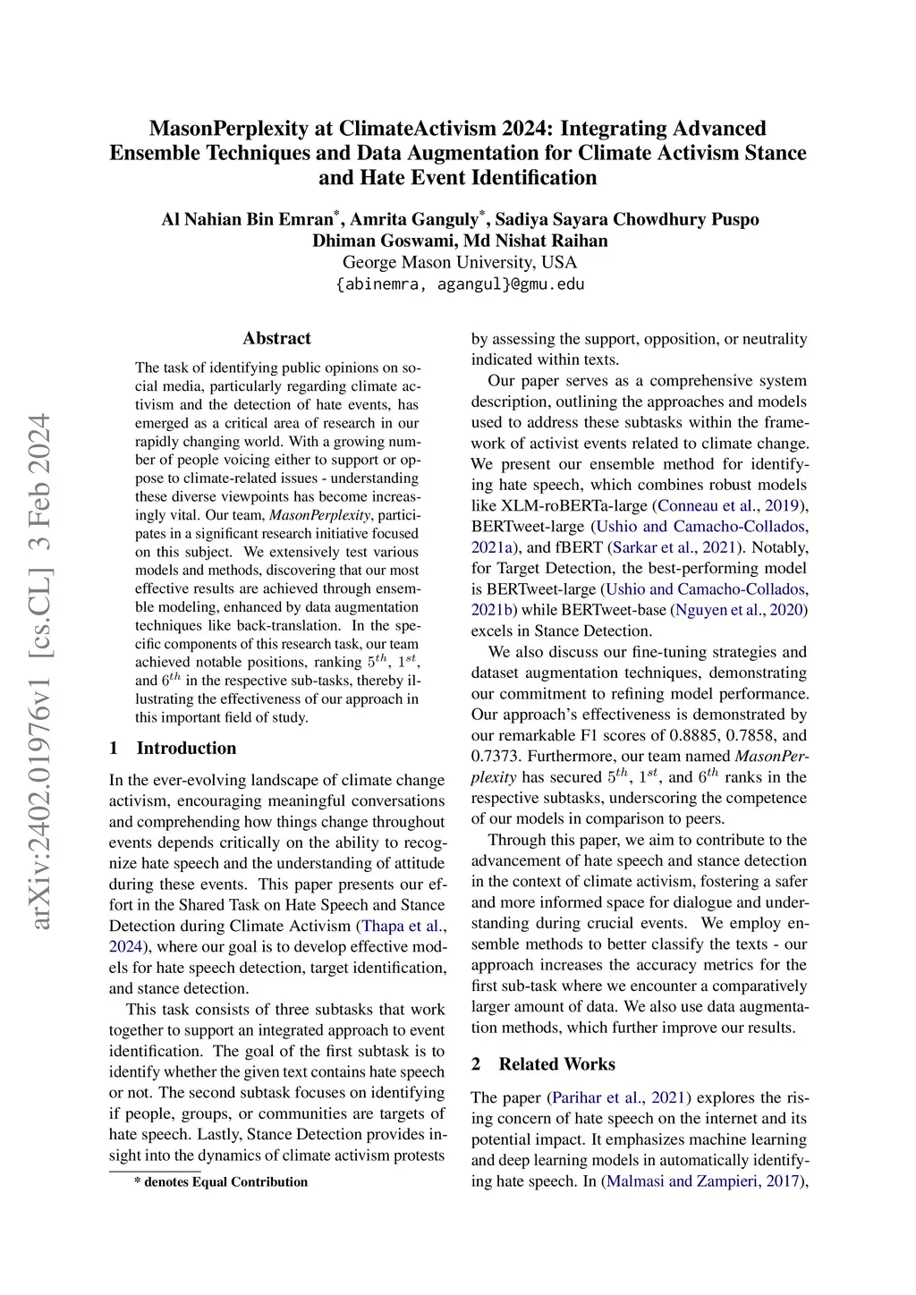MasonPerplexity at ClimateActivism 2024: Integrating Advanced Ensemble