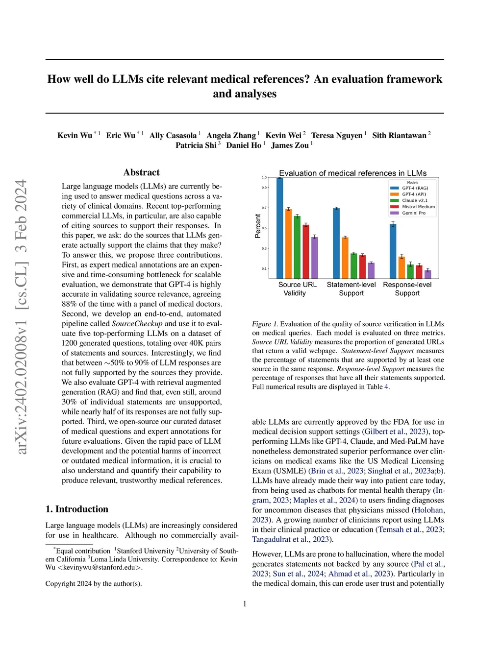 Large language models (LLMs) are currently being used to answer medical questions across a variety of clinical domains. Recent top-performing commercial LLMs, in particular, are also capable of citing sources to support their responses. In this paper, we ask: do the sources that LLMs generate actually support the claims that they make? To answer this, we propose three contributions. First, as expert medical annotations are an expensive and time-consuming bottleneck for scalable evaluation, we demonstrate that GPT-4 is highly accurate in validating source relevance, agreeing 88% of the time with a panel of medical doctors. Second, we develop an end-to-end, automated pipeline called \textit{SourceCheckup} and use it to evaluate five top-performing LLMs on a dataset of 1200 generated questions, totaling over 40K pairs of statements and sources. Interestingly, we find that between ~50% to 90% of LLM responses are not fully supported by the sources they provide. We also evaluate GPT-4 with retrieval augmented generation (RAG) and find that, even still, around 30\% of individual statements are unsupported, while nearly half of its responses are not fully supported. Third, we open-source our curated dataset of medical questions and expert annotations for future evaluations. Given the rapid pace of LLM development and the potential harms of incorrect or outdated medical information, it is crucial to also understand and quantify their capability to produce relevant, trustworthy medical references.