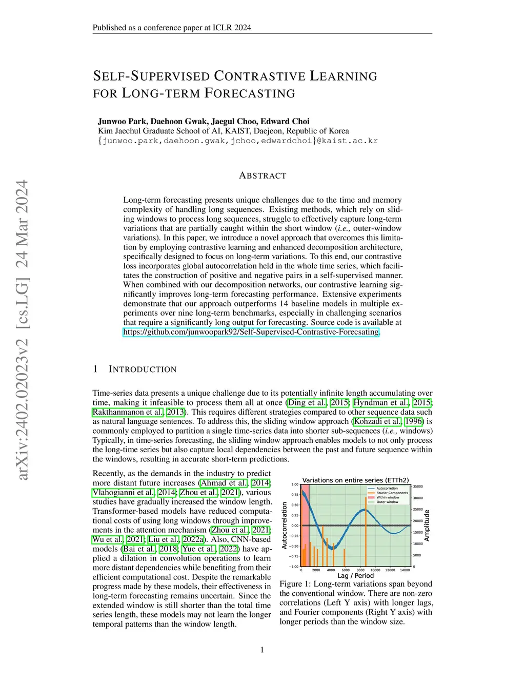 Long-term forecasting presents unique challenges due to the time and memory complexity of handling long sequences. Existing methods, which rely on sliding windows to process long sequences, struggle to effectively capture long-term variations that are partially caught within the short window (i.e., outer-window variations). In this paper, we introduce a novel approach that overcomes this limitation by employing contrastive learning and enhanced decomposition architecture, specifically designed to focus on long-term variations. To this end, our contrastive loss incorporates global autocorrelation held in the whole time series, which facilitates the construction of positive and negative pairs in a self-supervised manner. When combined with our decomposition networks, our contrastive learning significantly improves long-term forecasting performance. Extensive experiments demonstrate that our approach outperforms 14 baseline models in multiple experiments over nine long-term benchmarks, especially in challenging scenarios that require a significantly long output for forecasting. Source code is available at https://github.com/junwoopark92/Self-Supervised-Contrastive-Forecsating.