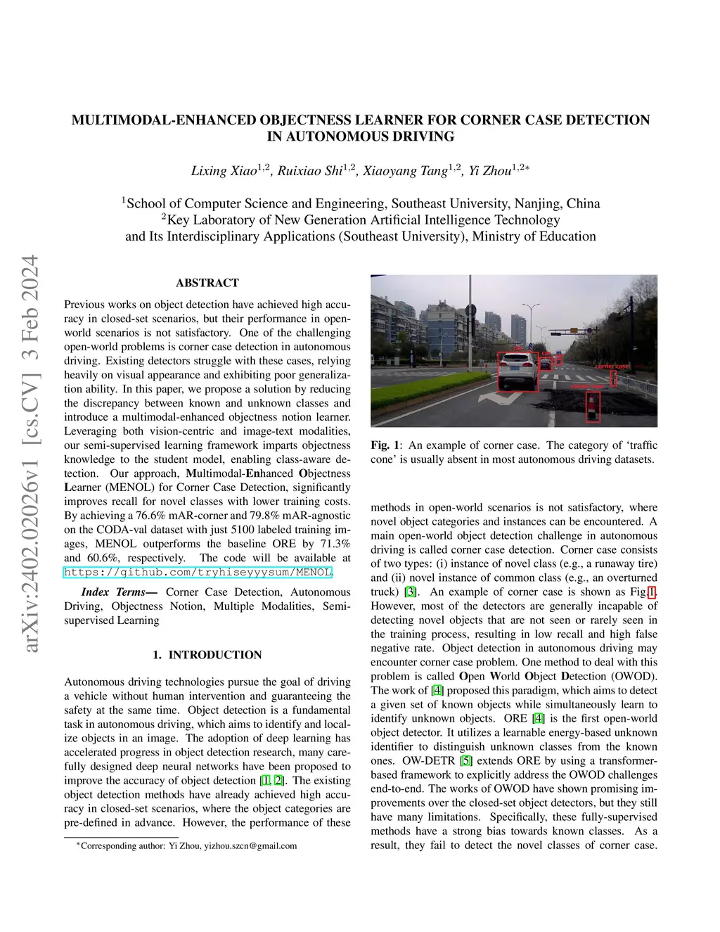 Previous works on object detection have achieved high accuracy in closed-set scenarios, but their performance in open-world scenarios is not satisfactory. One of the challenging open-world problems is corner case detection in autonomous driving. Existing detectors struggle with these cases, relying heavily on visual appearance and exhibiting poor generalization ability. In this paper, we propose a solution by reducing the discrepancy between known and unknown classes and introduce a multimodal-enhanced objectness notion learner. Leveraging both vision-centric and image-text modalities, our semi-supervised learning framework imparts objectness knowledge to the student model, enabling class-aware detection. Our approach, Multimodal-Enhanced Objectness Learner (MENOL) for Corner Case Detection, significantly improves recall for novel classes with lower training costs. By achieving a 76.6% mAR-corner and 79.8% mAR-agnostic on the CODA-val dataset with just 5100 labeled training images, MENOL outperforms the baseline ORE by 71.3% and 60.6%, respectively. The code will be available at https://github.com/tryhiseyyysum/MENOL.
