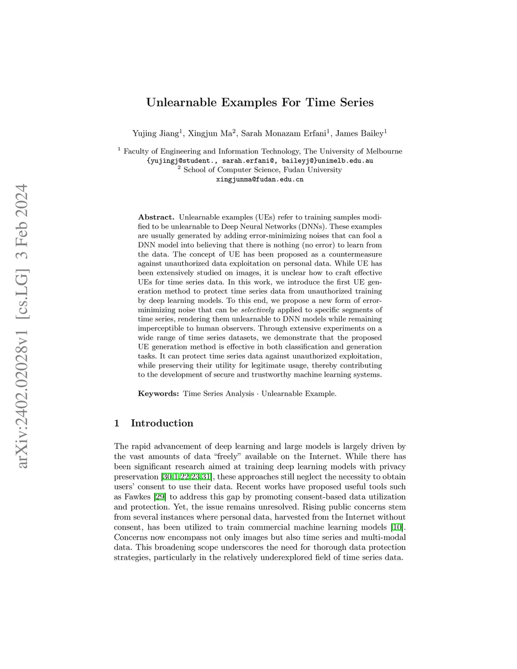 Unlearnable examples (UEs) refer to training samples modified to be unlearnable to Deep Neural Networks (DNNs). These examples are usually generated by adding error-minimizing noises that can fool a DNN model into believing that there is nothing (no error) to learn from the data. The concept of UE has been proposed as a countermeasure against unauthorized data exploitation on personal data. While UE has been extensively studied on images, it is unclear how to craft effective UEs for time series data. In this work, we introduce the first UE generation method to protect time series data from unauthorized training by deep learning models. To this end, we propose a new form of error-minimizing noise that can be \emph{selectively} applied to specific segments of time series, rendering them unlearnable to DNN models while remaining imperceptible to human observers. Through extensive experiments on a wide range of time series datasets, we demonstrate that the proposed UE generation method is effective in both classification and generation tasks. It can protect time series data against unauthorized exploitation, while preserving their utility for legitimate usage, thereby contributing to the development of secure and trustworthy machine learning systems.