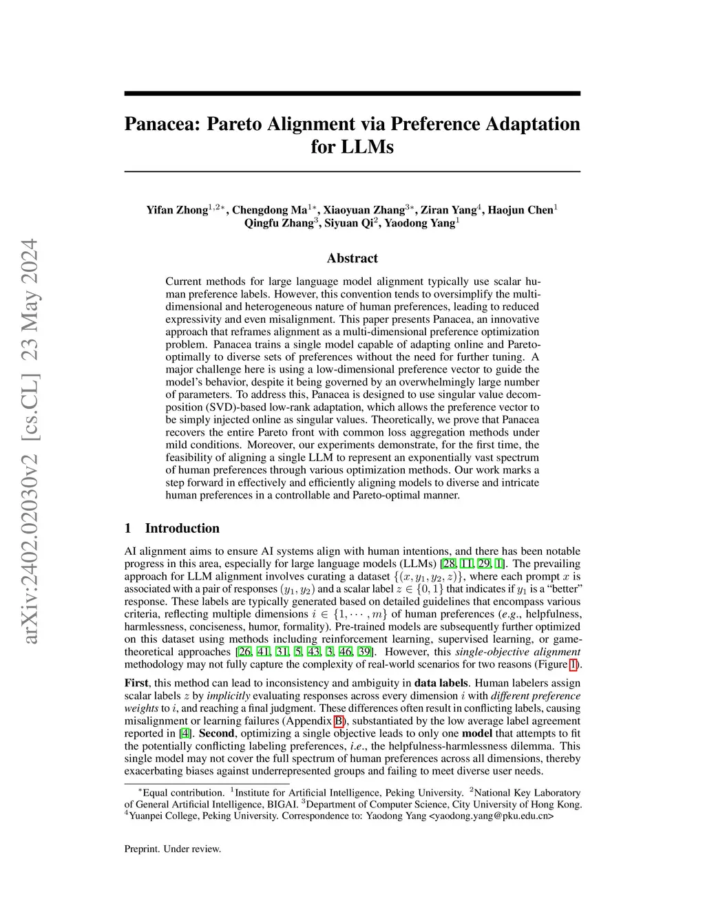 Current methods for large language model alignment typically use scalar human preference labels. However, this convention tends to oversimplify the multi-dimensional and heterogeneous nature of human preferences, leading to reduced expressivity and even misalignment. This paper presents Panacea, an innovative approach that reframes alignment as a multi-dimensional preference optimization problem. Panacea trains a single model capable of adapting online and Pareto-optimally to diverse sets of preferences without the need for further tuning. A major challenge here is using a low-dimensional preference vector to guide the model's behavior, despite it being governed by an overwhelmingly large number of parameters. To address this, Panacea is designed to use singular value decomposition (SVD)-based low-rank adaptation, which allows the preference vector to be simply injected online as singular values. Theoretically, we prove that Panacea recovers the entire Pareto front with common loss aggregation methods under mild conditions. Moreover, our experiments demonstrate, for the first time, the feasibility of aligning a single LLM to represent an exponentially vast spectrum of human preferences through various optimization methods. Our work marks a step forward in effectively and efficiently aligning models to diverse and intricate human preferences in a controllable and Pareto-optimal manner.