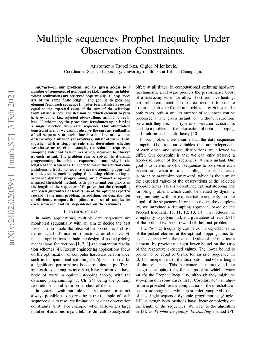 In our problem, we are given access to a number of sequences of nonnegative i.i.d. random variables, whose realizations are observed sequentially. All sequences are of the same finite length. The goal is to pick one element from each sequence in order to maximize a reward equal to the expected value of the sum of the selections from all sequences. The decision on which element to pick is irrevocable, i.e., rejected observations cannot be revisited. Furthermore, the procedure terminates upon having a single selection from each sequence. Our observation constraint is that we cannot observe the current realization of all sequences at each time instant. Instead, we can observe only a smaller, yet arbitrary, subset of them. Thus, together with a stopping rule that determines whether we choose or reject the sample, the solution requires a sampling rule that determines which sequence to observe at each instant. The problem can be solved via dynamic programming, but with an exponential complexity in the length of the sequences. In order to make the solution computationally tractable, we introduce a decoupling approach and determine each stopping time using either a single-sequence dynamic programming, or a Prophet Inequality inspired threshold method, with polynomial complexity in the length of the sequences. We prove that the decoupling approach guarantees at least 0.745 of the optimal expected reward of the joint problem. In addition, we describe how to efficiently compute the optimal number of samples for each sequence, and its' dependence on the variances.