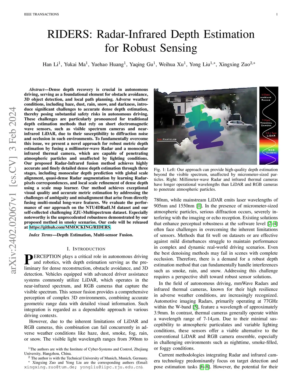 Dense depth recovery is crucial in autonomous driving, serving as a foundational element for obstacle avoidance, 3D object detection, and local path planning. Adverse weather conditions, including haze, dust, rain, snow, and darkness, introduce significant challenges to accurate dense depth estimation, thereby posing substantial safety risks in autonomous driving. These challenges are particularly pronounced for traditional depth estimation methods that rely on short electromagnetic wave sensors, such as visible spectrum cameras and near-infrared LiDAR, due to their susceptibility to diffraction noise and occlusion in such environments. To fundamentally overcome this issue, we present a novel approach for robust metric depth estimation by fusing a millimeter-wave Radar and a monocular infrared thermal camera, which are capable of penetrating atmospheric particles and unaffected by lighting conditions. Our proposed Radar-Infrared fusion method achieves highly accurate and finely detailed dense depth estimation through three stages, including monocular depth prediction with global scale alignment, quasi-dense Radar augmentation by learning Radar-pixels correspondences, and local scale refinement of dense depth using a scale map learner. Our method achieves exceptional visual quality and accurate metric estimation by addressing the challenges of ambiguity and misalignment that arise from directly fusing multi-modal long-wave features. We evaluate the performance of our approach on the NTU4DRadLM dataset and our self-collected challenging ZJU-Multispectrum dataset. Especially noteworthy is the unprecedented robustness demonstrated by our proposed method in smoky scenarios. Our code will be released at \url{https://github.com/MMOCKING/RIDERS}.