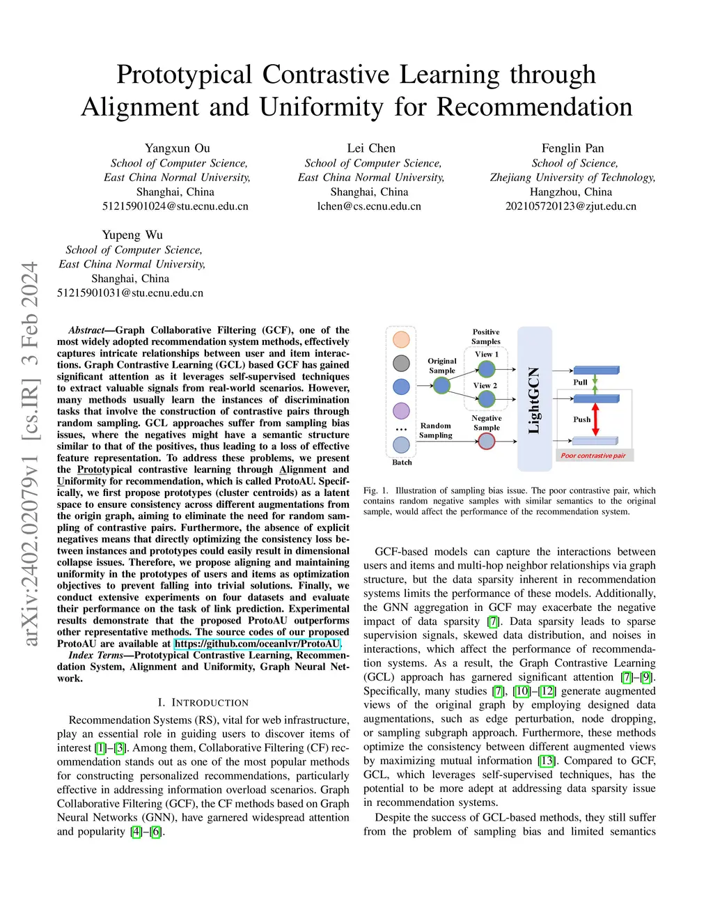 Graph Collaborative Filtering (GCF), one of the most widely adopted recommendation system methods, effectively captures intricate relationships between user and item interactions. Graph Contrastive Learning (GCL) based GCF has gained significant attention as it leverages self-supervised techniques to extract valuable signals from real-world scenarios. However, many methods usually learn the instances of discrimination tasks that involve the construction of contrastive pairs through random sampling. GCL approaches suffer from sampling bias issues, where the negatives might have a semantic structure similar to that of the positives, thus leading to a loss of effective feature representation. To address these problems, we present the \underline{Proto}typical contrastive learning through \underline{A}lignment and \underline{U}niformity for recommendation, which is called \textbf{ProtoAU}. Specifically, we first propose prototypes (cluster centroids) as a latent space to ensure consistency across different augmentations from the origin graph, aiming to eliminate the need for random sampling of contrastive pairs. Furthermore, the absence of explicit negatives means that directly optimizing the consistency loss between instance and prototype could easily result in dimensional collapse issues. Therefore, we propose aligning and maintaining uniformity in the prototypes of users and items as optimization objectives to prevent falling into trivial solutions. Finally, we conduct extensive experiments on four datasets and evaluate their performance on the task of link prediction. Experimental results demonstrate that the proposed ProtoAU outperforms other representative methods. The source codes of our proposed ProtoAU are available at \url{https://github.com/oceanlvr/ProtoAU}.