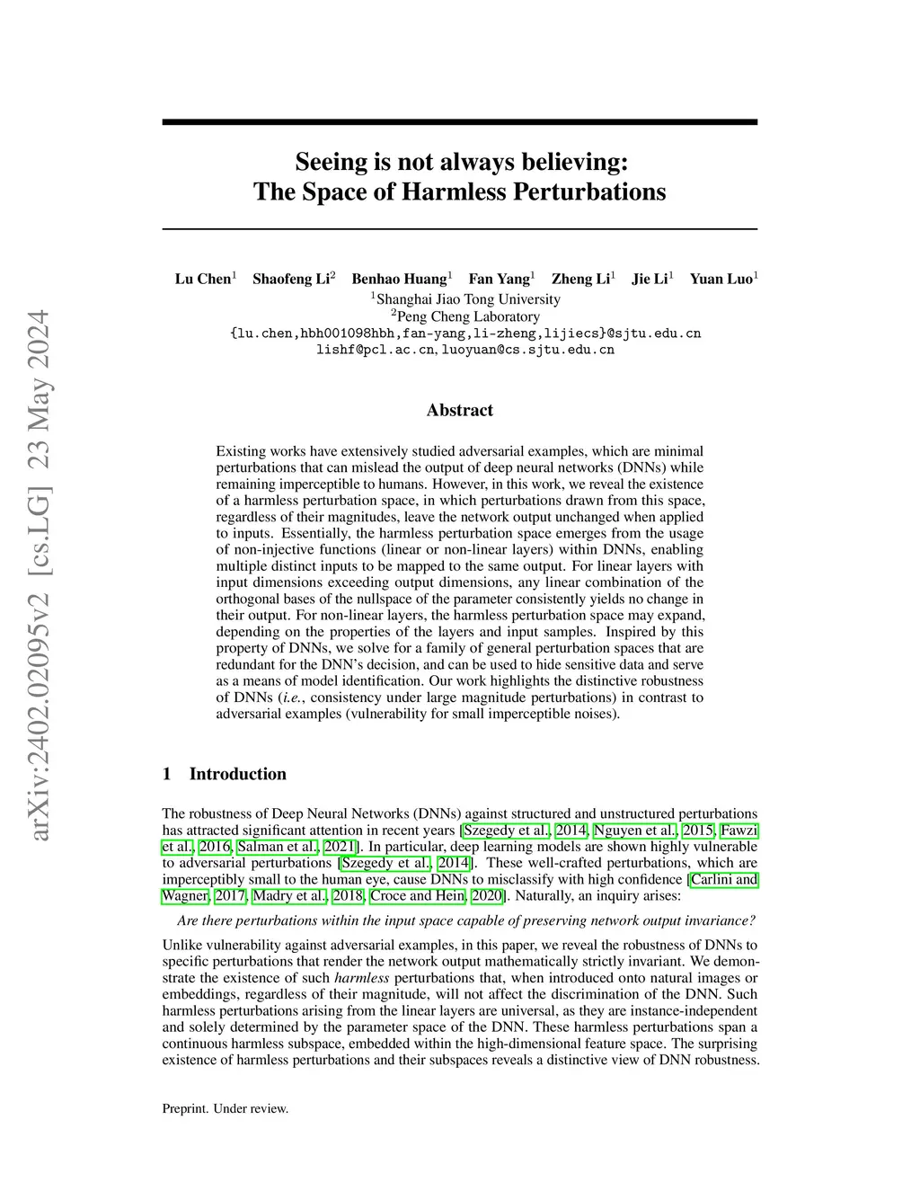 In the context of deep neural networks, we expose the existence of a harmless perturbation space, where perturbations leave the network output entirely unaltered. Perturbations within this harmless perturbation space, regardless of their magnitude when applied to images, exhibit no impact on the network's outputs of the original images. Specifically, given any linear layer within the network, where the input dimension exceeds the output dimension , we demonstrate the existence of a continuous harmless perturbation subspace with a dimension of . Inspired by this, we solve for a family of general perturbations that consistently influence the network output, irrespective of their magnitudes. With these theoretical findings, we explore the application of harmless perturbations for privacy-preserving data usage. Our work reveals the difference between DNNs and human perception that the significant perturbations captured by humans may not affect the recognition of DNNs. As a result, we utilize this gap to design a type of harmless perturbation that is meaningless for humans while maintaining its recognizable features for DNNs.