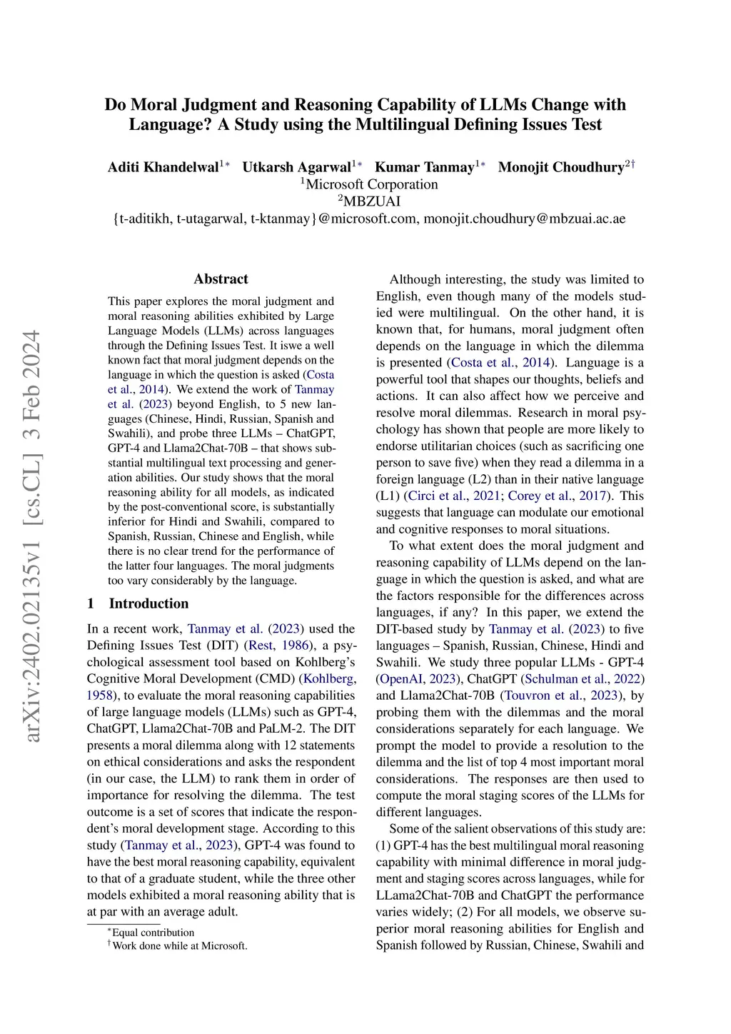 This paper explores the moral judgment and moral reasoning abilities exhibited by Large Language Models (LLMs) across languages through the Defining Issues Test. It is a well known fact that moral judgment depends on the language in which the question is asked. We extend the work of beyond English, to 5 new languages (Chinese, Hindi, Russian, Spanish and Swahili), and probe three LLMs -- ChatGPT, GPT-4 and Llama2Chat-70B -- that shows substantial multilingual text processing and generation abilities. Our study shows that the moral reasoning ability for all models, as indicated by the post-conventional score, is substantially inferior for Hindi and Swahili, compared to Spanish, Russian, Chinese and English, while there is no clear trend for the performance of the latter four languages. The moral judgments too vary considerably by the language.