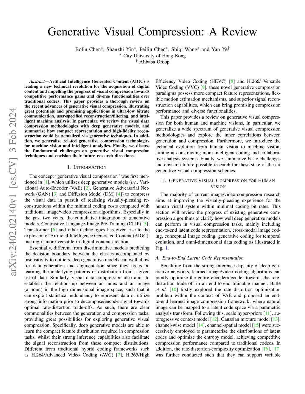 Artificial Intelligence Generated Content (AIGC) is leading a new technical revolution for the acquisition of digital content and impelling the progress of visual compression towards competitive performance gains and diverse functionalities over traditional codecs. This paper provides a thorough review on the recent advances of generative visual compression, illustrating great potentials and promising applications in ultra-low bitrate communication, user-specified reconstruction/filtering, and intelligent machine analysis. In particular, we review the visual data compression methodologies with deep generative models, and summarize how compact representation and high-fidelity reconstruction could be actualized via generative techniques. In addition, we generalize related generative compression technologies for machine vision and intelligent analytics. Finally, we discuss the fundamental challenges on generative visual compression techniques and envision their future research directions.