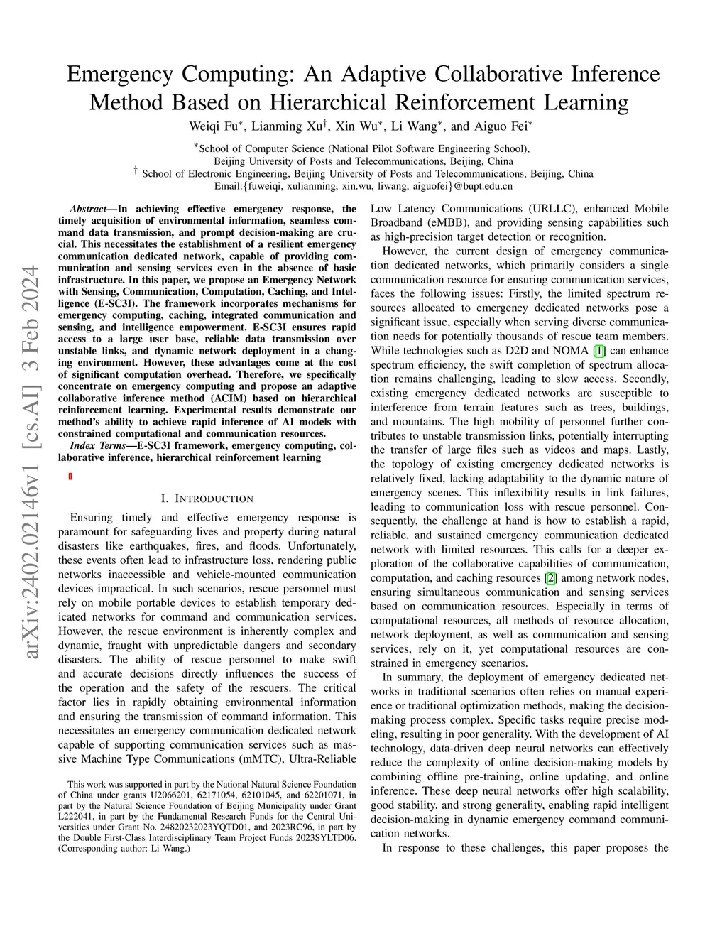 In achieving effective emergency response, the timely acquisition of environmental information, seamless command data transmission, and prompt decision-making are crucial. This necessitates the establishment of a resilient emergency communication dedicated network, capable of providing communication and sensing services even in the absence of basic infrastructure. In this paper, we propose an Emergency Network with Sensing, Communication, Computation, Caching, and Intelligence (E-SC3I). The framework incorporates mechanisms for emergency computing, caching, integrated communication and sensing, and intelligence empowerment. E-SC3I ensures rapid access to a large user base, reliable data transmission over unstable links, and dynamic network deployment in a changing environment. However, these advantages come at the cost of significant computation overhead. Therefore, we specifically concentrate on emergency computing and propose an adaptive collaborative inference method (ACIM) based on hierarchical reinforcement learning. Experimental results demonstrate our method's ability to achieve rapid inference of AI models with constrained computational and communication resources.