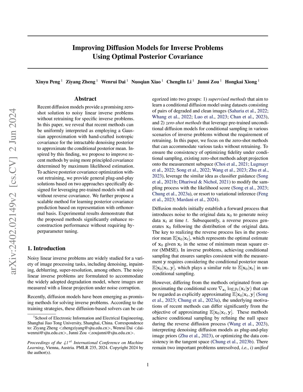 Recent diffusion models provide a promising zero-shot solution to noisy linear inverse problems without retraining for specific inverse problems. In this paper, we reveal that recent methods can be uniformly interpreted as employing a Gaussian approximation with hand-crafted isotropic covariance for the intractable denoising posterior to approximate the conditional posterior mean. Inspired by this finding, we propose to improve recent methods by using more principled covariance determined by maximum likelihood estimation. To achieve posterior covariance optimization without retraining, we provide general plug-and-play solutions based on two approaches specifically designed for leveraging pre-trained models with and without reverse covariance. We further propose a scalable method for learning posterior covariance prediction based on representation with orthonormal basis. Experimental results demonstrate that the proposed methods significantly enhance reconstruction performance without requiring hyperparameter tuning.