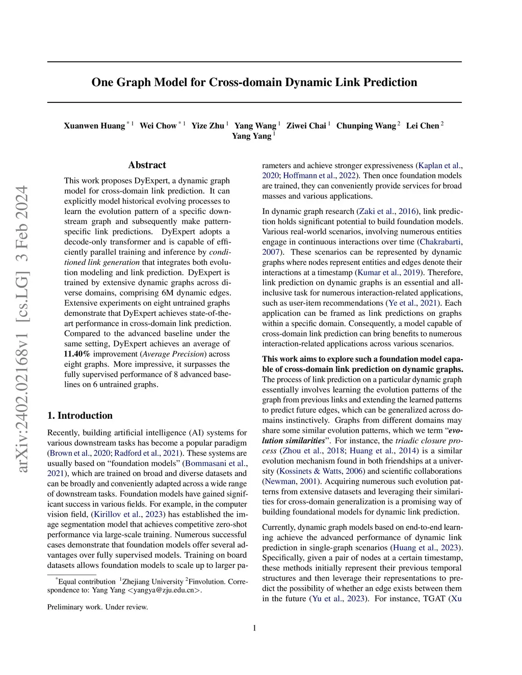 This work proposes DyExpert, a dynamic graph model for cross-domain link prediction. It can explicitly model historical evolving processes to learn the evolution pattern of a specific downstream graph and subsequently make pattern-specific link predictions. DyExpert adopts a decode-only transformer and is capable of efficiently parallel training and inference by \textit{conditioned link generation} that integrates both evolution modeling and link prediction. DyExpert is trained by extensive dynamic graphs across diverse domains, comprising 6M dynamic edges. Extensive experiments on eight untrained graphs demonstrate that DyExpert achieves state-of-the-art performance in cross-domain link prediction. Compared to the advanced baseline under the same setting, DyExpert achieves an average of 11.40% improvement Average Precision across eight graphs. More impressive, it surpasses the fully supervised performance of 8 advanced baselines on 6 untrained graphs.
