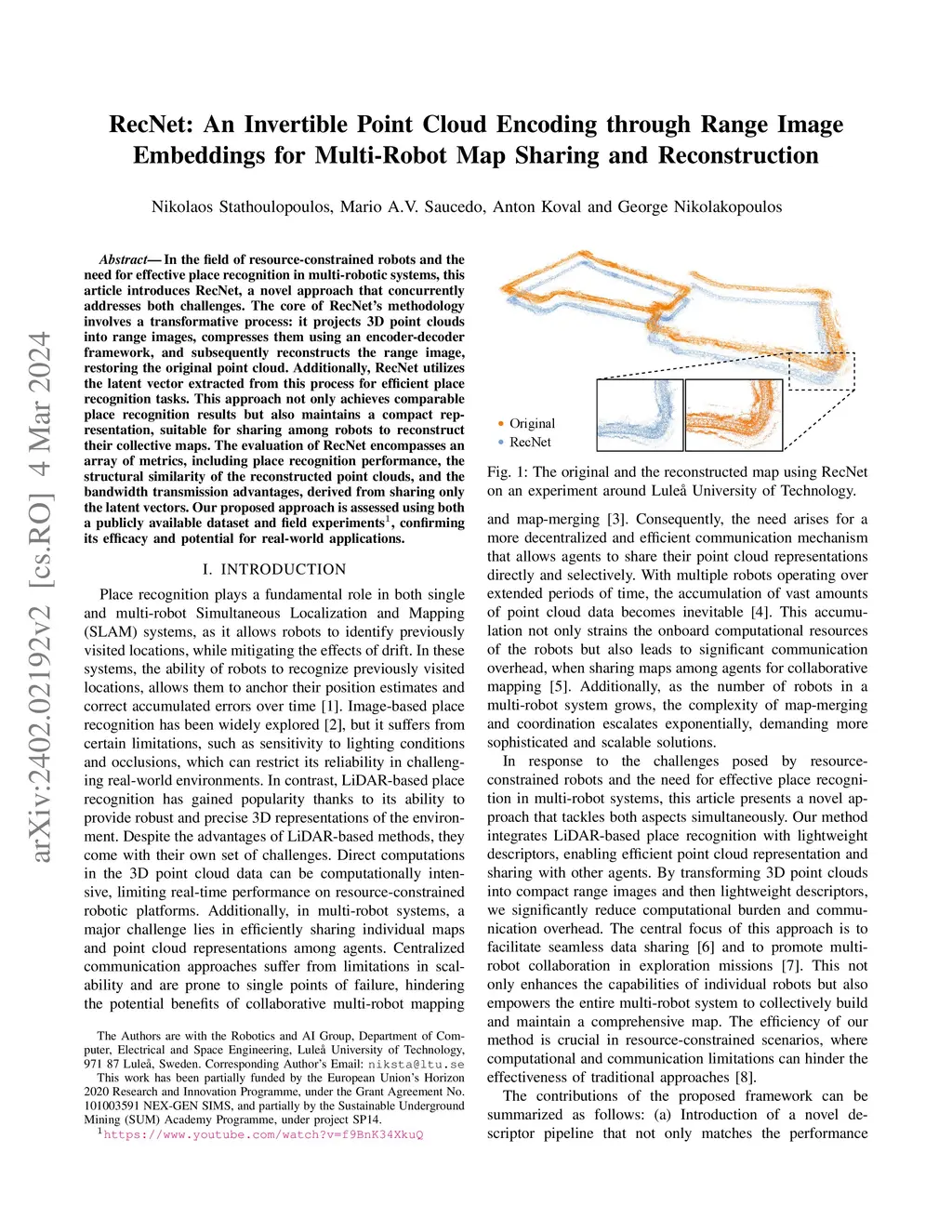 In the field of resource-constrained robots and the need for effective place recognition in multi-robotic systems, this article introduces RecNet, a novel approach that concurrently addresses both challenges. The core of RecNet's methodology involves a transformative process: it projects 3D point clouds into range images, compresses them using an encoder-decoder framework, and subsequently reconstructs the range image, restoring the original point cloud. Additionally, RecNet utilizes the latent vector extracted from this process for efficient place recognition tasks. This approach not only achieves comparable place recognition results but also maintains a compact representation, suitable for sharing among robots to reconstruct their collective maps. The evaluation of RecNet encompasses an array of metrics, including place recognition performance, the structural similarity of the reconstructed point clouds, and the bandwidth transmission advantages, derived from sharing only the latent vectors. Our proposed approach is assessed using both a publicly available dataset and field experiments, confirming its efficacy and potential for real-world applications.
